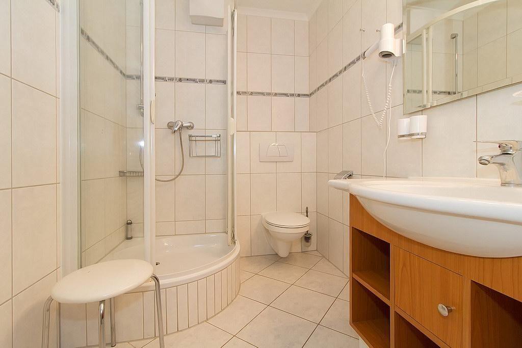 In der gefliesten Ferienwohnung befinden sich zwei separate Schlafzimmer mit einem Doppelbett bzw. zwei Einzelbetten und jeweils einem TV, ein Badezimmer mit Föhn, ein Gäste-WC sowie ein Wohnbereich mit tollem Meerblick. Nicht nur der überdachte Balkon und der Wohnbereich bieten Meerblick, auch vom Schlafzimmer aus könnt ihr bis zur Ostsee sehen.