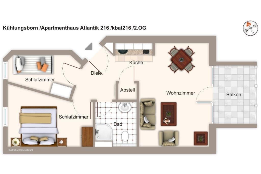 Im "Apartmenthaus Atlantik" in Kühlungsborn findet ihr Ferienwohnungen in erstklassiger Strandlage. Das 3-Zimmer-Apartment bietet mit 50 qm und einem Balkon Platz für 3 Personen.