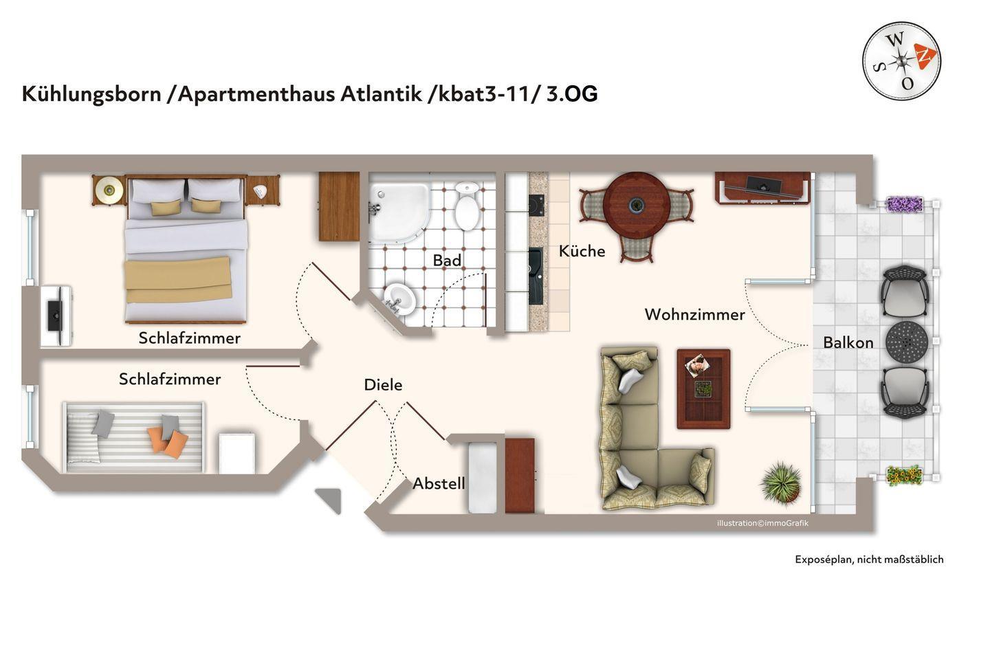 Komfortable Ferienwohnungen in direkter Strandlage findet ihr in der Apartment-Anlage „Apartmenthaus Atlantik“ in Kühlungsborn: Das 52 qm große 3-Zimmer Apartment mit Balkon bietet Platz für 3 Personen und verfügt über einen einmalig-schönen Meerblick!