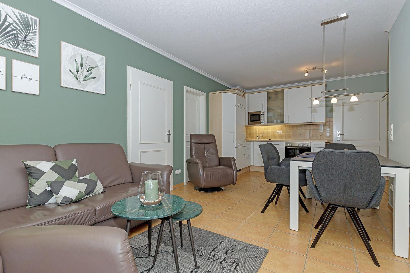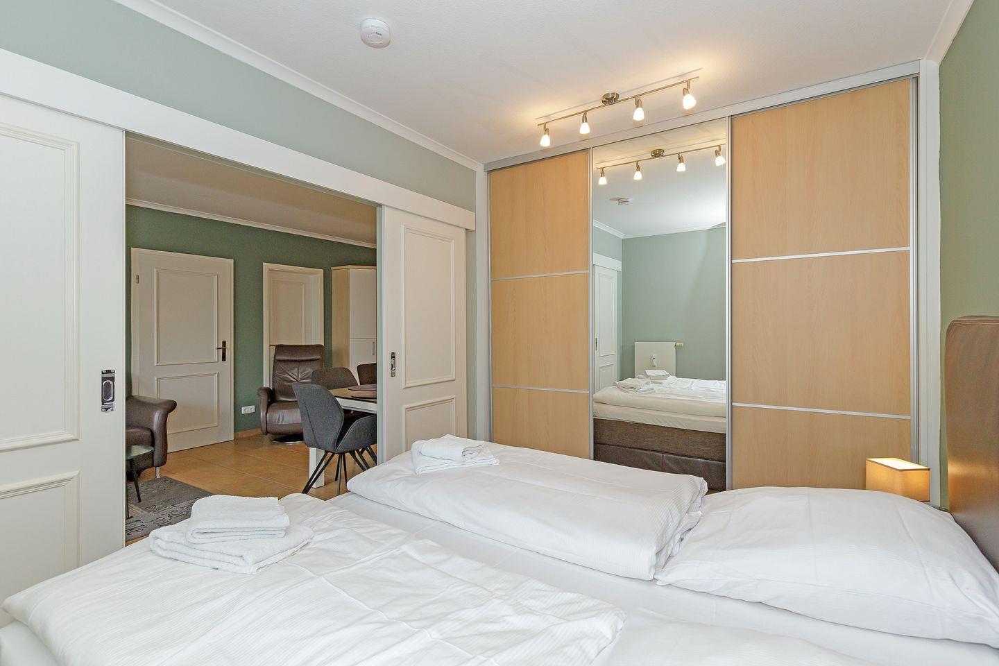 Das liebevoll gestaltete Nichtraucher-Apartment ist durchgängig gefliest und verfügt über bodentiefe Fester, kostenfreies WLAN und eine voll ausgestattete offene Küche mit Geschirrspüler, Kühlschrank mit Gefrierfach, Kaffeemaschine, Toaster, Wasserkocher, Backofen und Mikrowelle sowie über einen Essbereich. Im angrenzenden Wohnbereich befindet sich eine hochwertige Ledersitzgruppe und ein Flatscreen-TV. Zwei separate Schlafzimmer stehen euch zur Verfügung und sind mit einem modernen Boxspringbett (1,80 x 2,00 m) bzw. mit einem Etagenbett für zwei Personen ausgestattet.