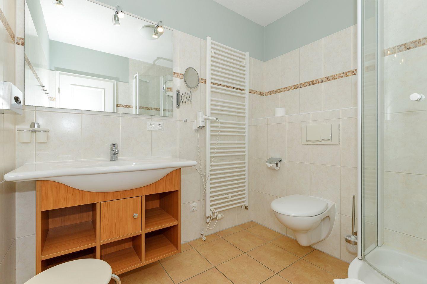 Das Badezimmer verfügt über eine große Eck-Dusche, WC, Waschtisch, Föhn, Kosmetikspiegel und Handtuchheizkörper.