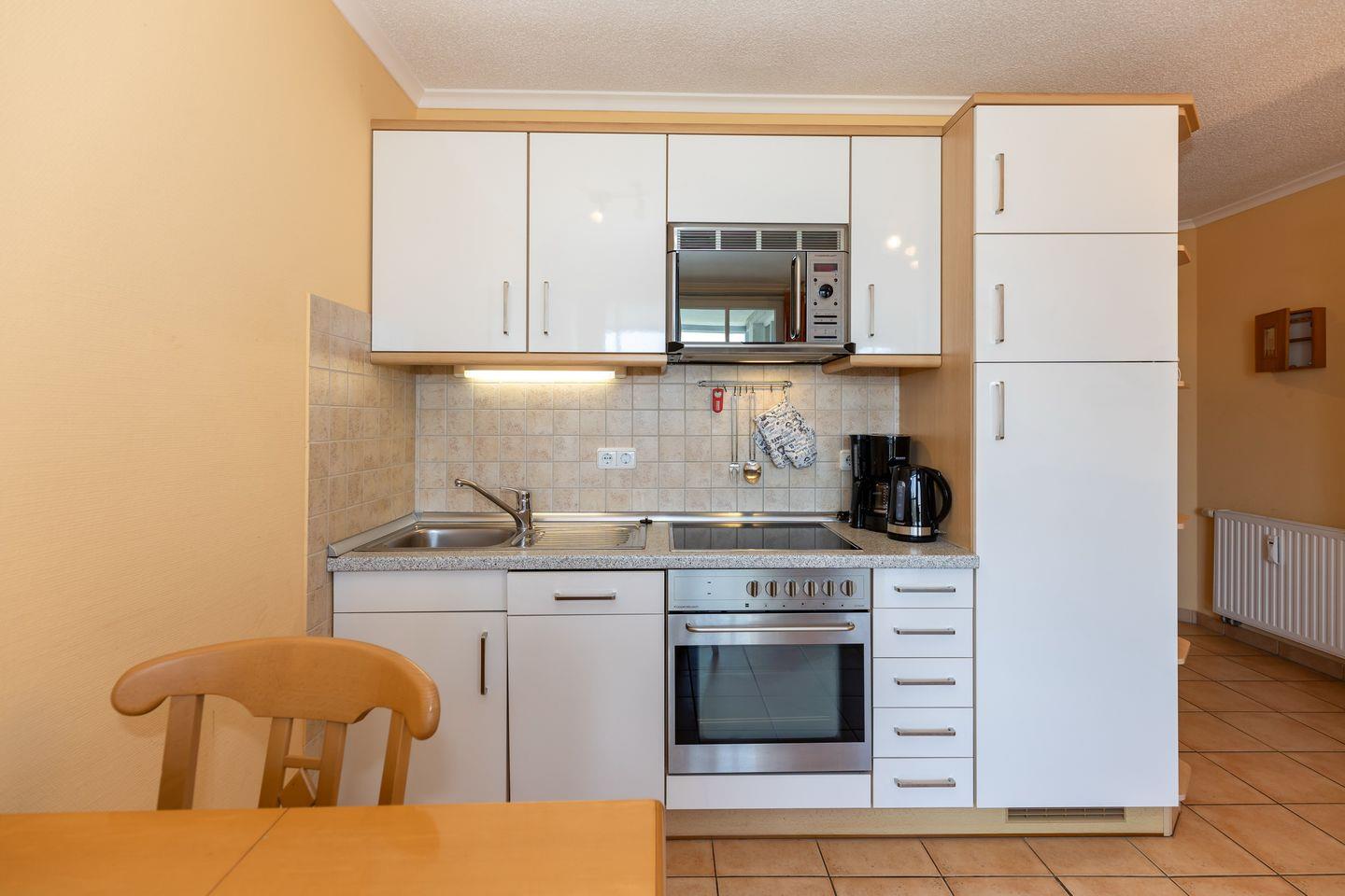 Die Ferienwohnung beinhaltet eine voll ausgestattete offene Küche mit Backofen, Mikrowelle und Geschirrspüler sowie Bügeleisen und Bügelbrett, Föhn, Radio und einen Flatscreen-TV. Der WLAN Anschluss steht euch kostenfrei zur Verfügung.
