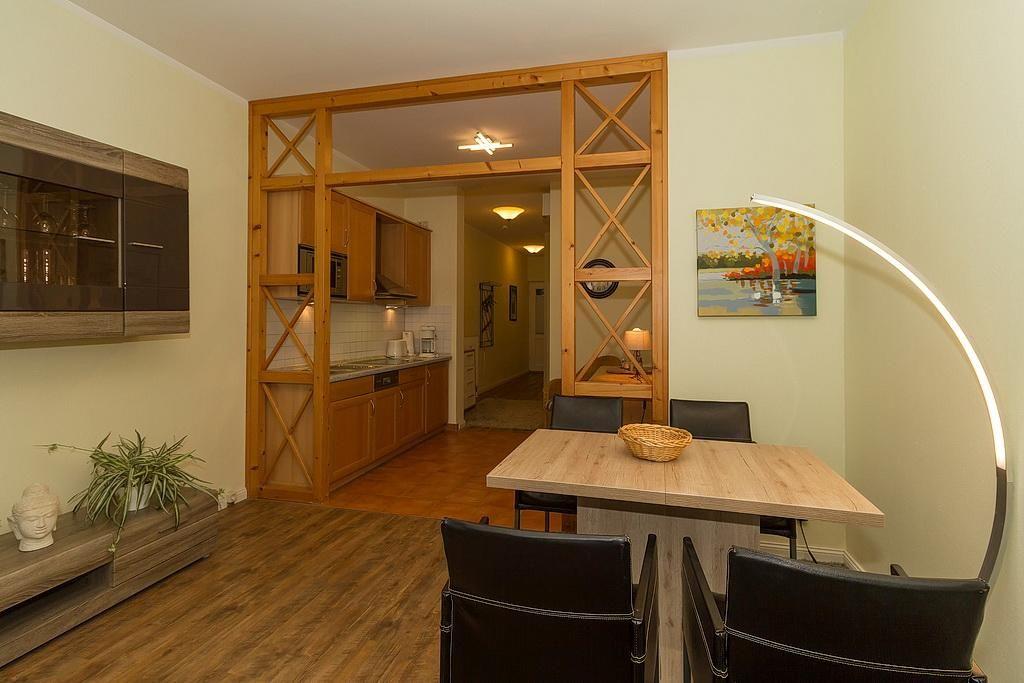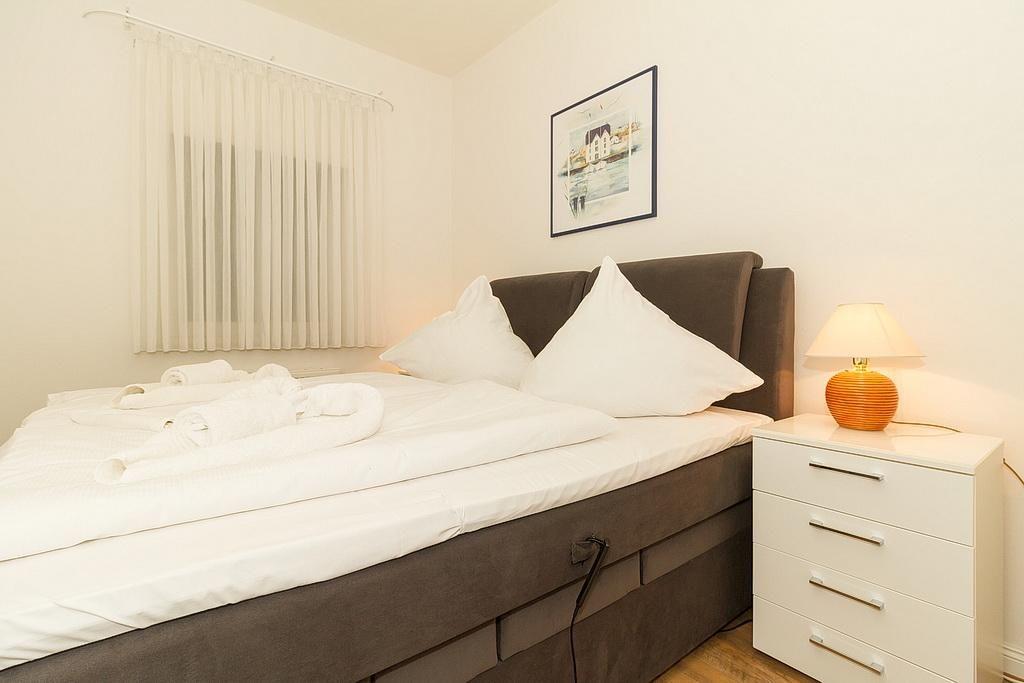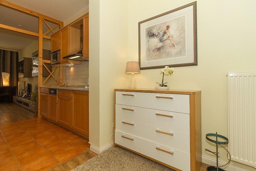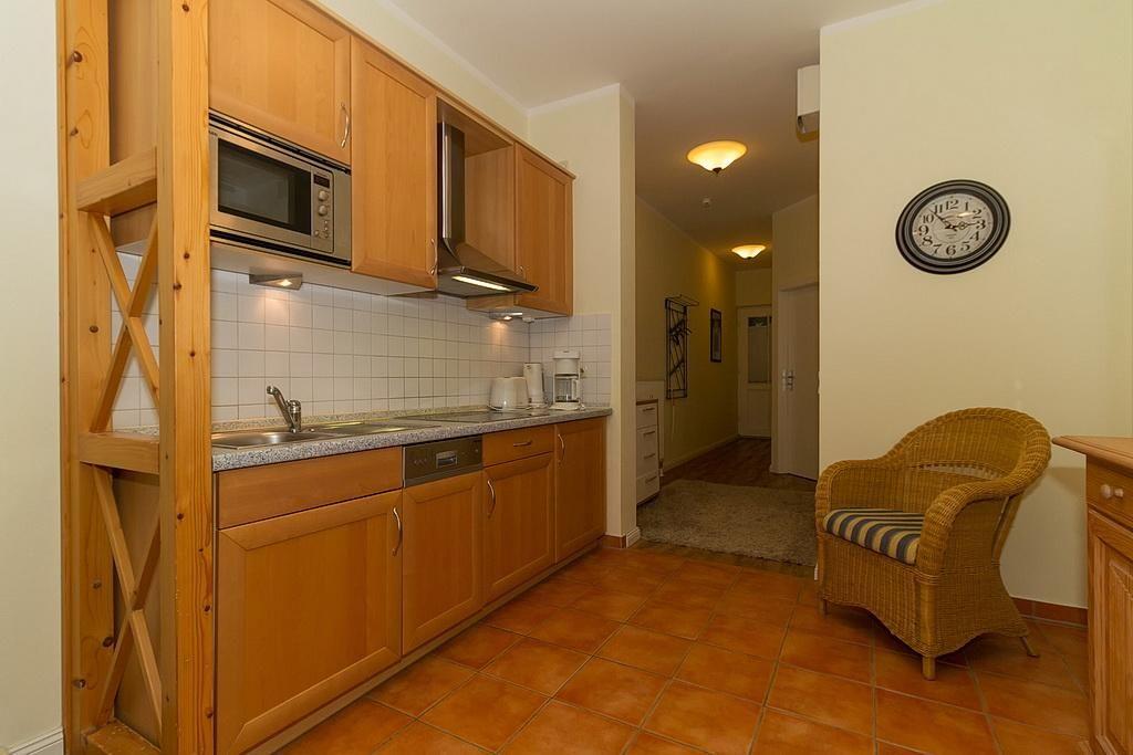 Das Nichtraucher-Apartment verfügt über kostenfreies WLAN und eine voll ausgestattete offene Küche mit Geschirrspüler, Mikrowelle, Wasserkocher, Kaffeemaschine, Toaster und Tiefkühlfach. Der kombinierte Wohn- und Essbereich verfügt über eine TV-HiFi-Anlage mit Flachbild-TV. Sowohl der Esstisch, als auch der behagliche Sitzbereich mit Schlafcouch bieten genügend Platz, um schöne Stunden beim Frühstück oder nach einem ereignisreichen Tag am Strand zu verbringen. Das separate Schlafzimmer ist ausgestattet mit einem großen Boxspringbett (2 x 0,90 x 2,00). Das Schlafzimmerfenster liegt zum Atrium, dem begrünten, überdachten Innenhof des Gebäudes. Die Wohnung verfügt über eine kleine, überdachte Terrasse in Ost-Lage.