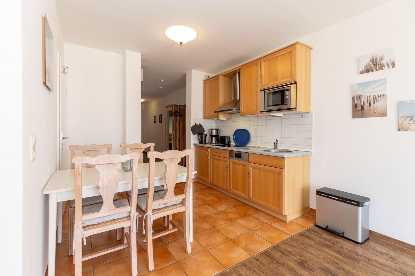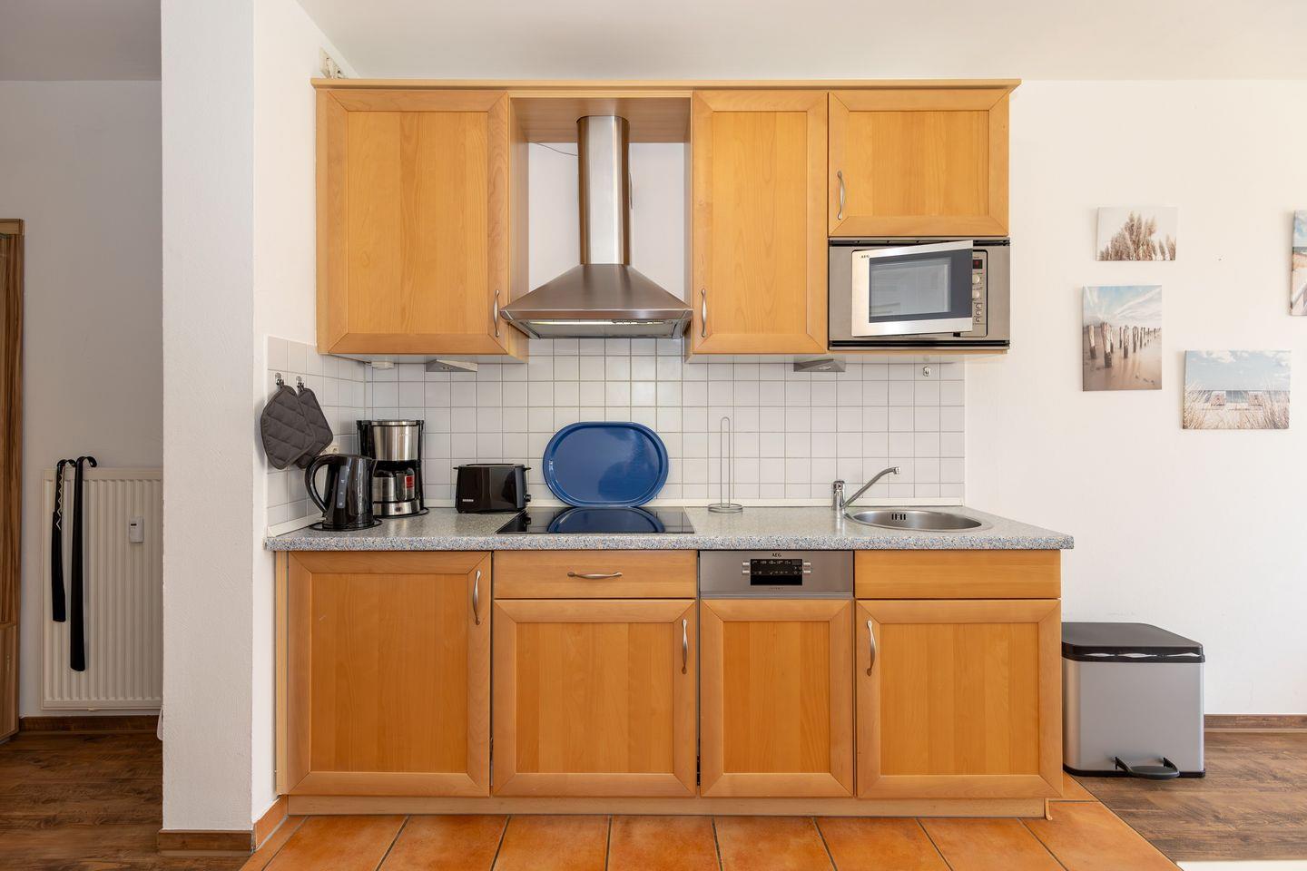 Das gemütliche Nichtraucher-Apartment verfügt über kostenfreies WLAN und eine voll ausgestattete offene Küche mit Geschirrspüler, Mikrowelle, Wasserkocher, Kaffeemaschine, Toaster und Tiefkühlfach. Der kombinierte Wohn- und Essbereich verfügt über eine TV-HiFi-Anlage mit Flachbild-TV, DVD-Player und eine Doppelschlafcouch. Sowohl der Esstisch, als auch der behagliche Sitzbereich bieten genügend Platz, um schöne Stunden beim Frühstück oder nach einem ereignisreichen Tag am Strand zu verbringen. Überdies verfügt die Ferienwohnung über ein Bügeleisen, ein Bügelbrett und einen Föhn. Das separate Schlafzimmer ist ausgestattet mit einem großen Doppelbett (2 x 0,90 x 2,00). Das Schlafzimmerfenster liegt zum Atrium, dem begrünten, überdachten Innenhof des Gebäudes. Vom teilüberdachten Balkon habt ihr einen seitlichen Blick auf die Ostsee. Der Balkon ist vom Wohn-/ Essbereich zugänglich.