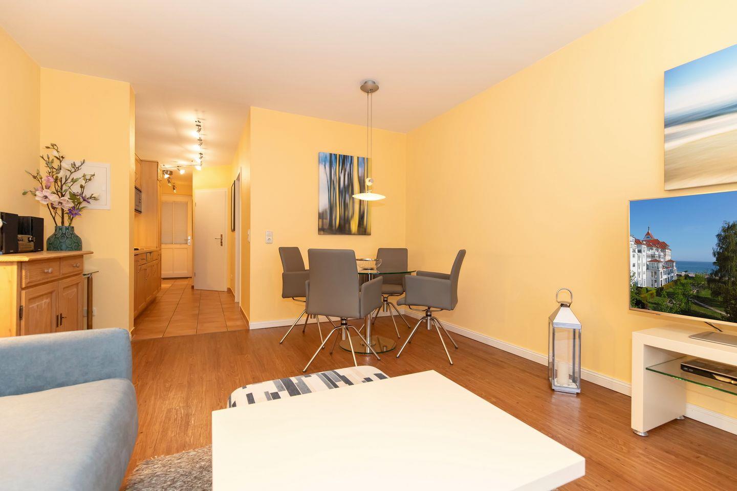Das gemütliche Nichtraucher-Apartment verfügt über kostenfreies WLAN und eine voll ausgestattete offene Küche mit Geschirrspüler, Mikrowelle, Glaskeramik-Kochfeld mit 4 Kochzonen, Wasserkocher, Kaffeemaschine und Toaster. Der kombinierte Wohn- und Essbereich verfügt über eine TV-HiFi-Anlage mit Flachbild-TV (49 Zoll), Blue-Ray-Player und eine Doppelschlafcouch. Sowohl der Esstisch, als auch der behagliche Sitzbereich bieten genügend Platz, um schöne Stunden beim Frühstück oder nach einem ereignisreichen Tag am Strand zu verbringen. Überdies verfügt die Ferienwohnung über ein Bügeleisen, ein Bügelbrett, einen Föhn und einen Mini-Safe. Das separate Schlafzimmer ist ausgestattet mit einem großen Doppelbett (2 x 0,90 x 2,00). Das Schlafzimmerfenster liegt zum Atrium, dem begrünten, überdachten Innenhof des Gebäudes. Vom Balkon habt ihr einen seitlichen Blick auf die Ostsee. Der Balkon ist vom Wohn-/ Essbereich zugänglich.