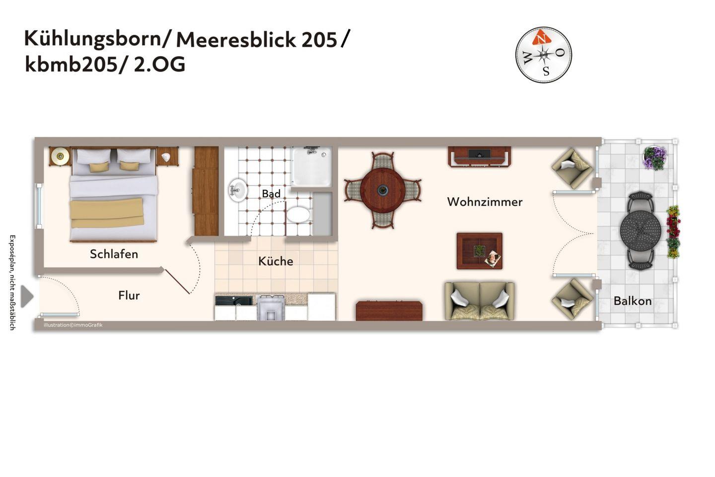 Das 47 m² große 2-Zimmer-Apartment ist für bis zu 4 Personen geeignet. Besonders hervorzuheben ist die direkte Strandlage der Apartmentanlage und der nach Osten gelegene Balkon mit seitlichem Blick auf die Ostsee.