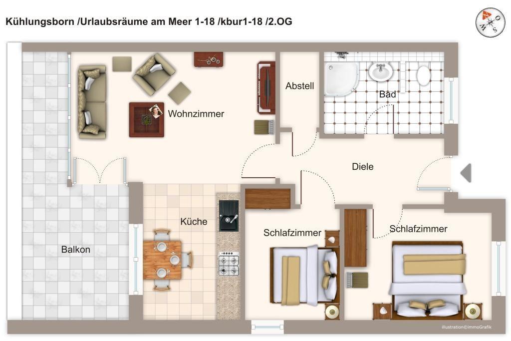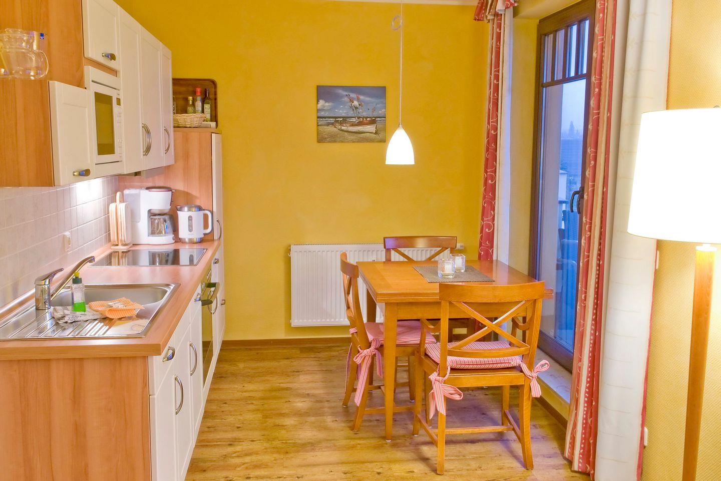 Das hochwertige Interieur der Ferienwohnung ergibt sich aus einer voll ausgestatteten offenen Küche mit Backofen, Mikrowelle, Wasserkocher, Kaffeemaschine, Toaster, Geschirrspüler, Tiefkühlfach, einer TV-HiFi-Ausstattung mit Blu-ray-Player, Bügelbrett und Bügeleisen, Minisafe, einem Föhn und Kosmetikspiegel. Dusche und WC sind durch einen Raumteiler getrennt; ein Abstellraum ist vorhanden. Die Loggia bietet euch einen seitlichen Blick auf die nahe Ostsee. Ein Kinderbett kann gegen Entgelt aufgestellt werden und auf Wunsch könnt ihr einen Hochstuhl hinzubuchen.