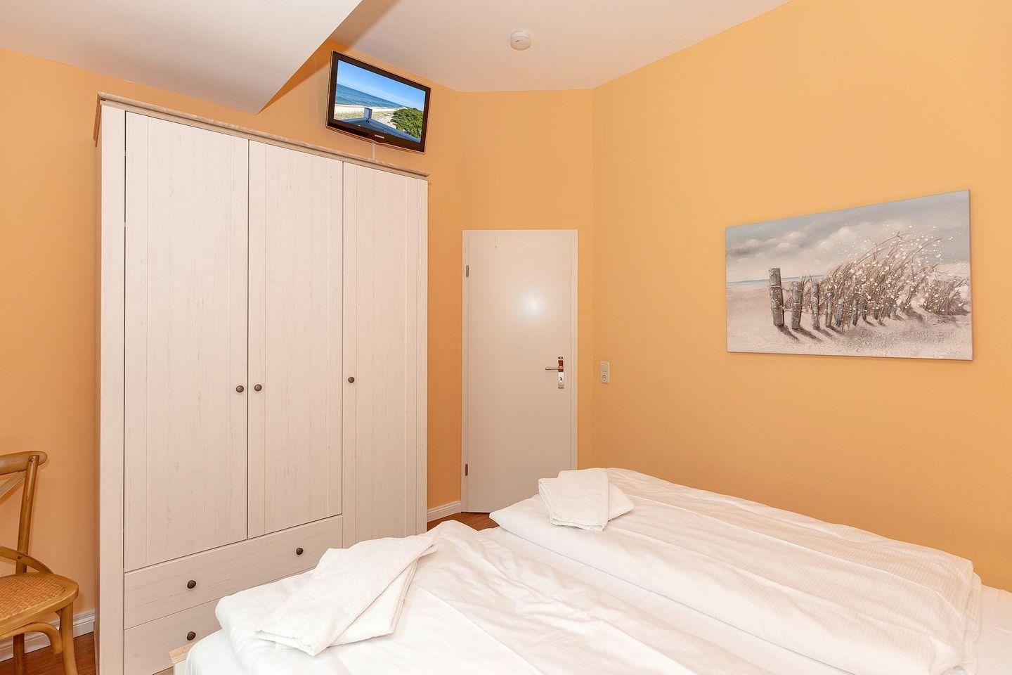 Sowohl der Esstisch, als auch der behagliche Sitzbereich bieten genügend Platz, um schöne Stunden beim Frühstück oder auch nach einem ereignisreichen Tag am Strand zu verbringen. Die Wohnung verfügt über zwei separate Badezimmer jeweils mit Dusche, WC, Waschbecken und Föhn. Im Dachzimmer befindet sich eine eine gemütliche Sitzecke mit Sesseln und einem Sofa. Überdies bietet die charmante Turmwohnung zwei separate Schlafzimmer. Eines ist mit einem großen Doppelbett (2 x 0,90 m x 2,00 m) und eigenem Flatscreen-TV ausgestattet; das Schlafzimmerfenster liegt hier zum Atrium, dem begrünten, überdachten Innenhof des Gebäudes. Das zweite Schlafzimmer verfügt über zwei Einzelbetten (0,90 m x 2,00 m) und befindet sich auf der zweiten Wohnebene. Ein Kinderbett kann gegen Entgelt aufgestellt werden und auf Wunsch könnt ihr einen Hochstuhl hinzubuchen. Vom mit Balkonmöbeln ausgestatteten Balkon habt ihr einen herrlichen Blick auf die Ostsee.