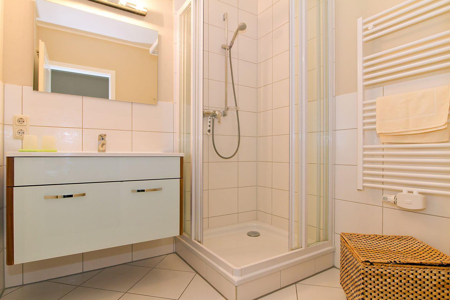 Wasserkocher, Kaffeemaschine, Toaster, Mikrowelle und Geschirrspüler gehören zur voll ausgestatteten offenen Küche; ein Föhn, ein Bügeleisen mit Bügelbrett und eine TV-HiFi-Anlage mit DVD-Player komplettieren das exklusive Interieur der Ferienwohnung. Dusche und WC des Apartments sind separat und ein Abstellraum ist ebenfalls in der Ferienwohnung vorhanden.