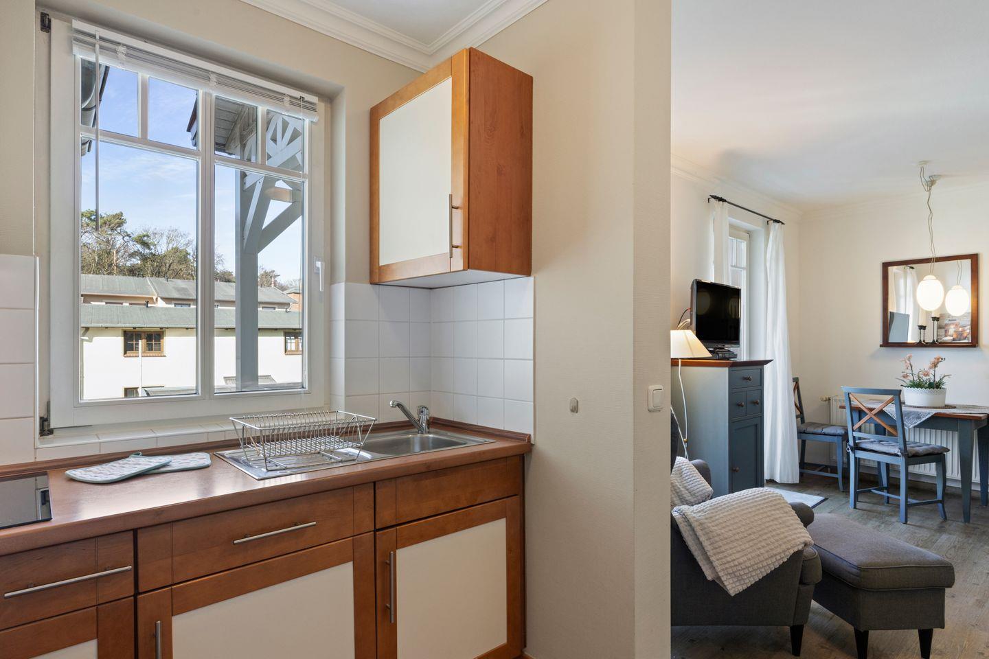 Die Ferienwohnung im 1. Obergeschoss der Anlage ist zentral zum Bahnhof Ost am Kühlungsborner Stadtwald gelegen. Ruhige Abende auf dem großen, überdachten Balkon in Richtung Westen sind hier garantiert. Durch die Lage des Apartments ist es hell und sonnig.