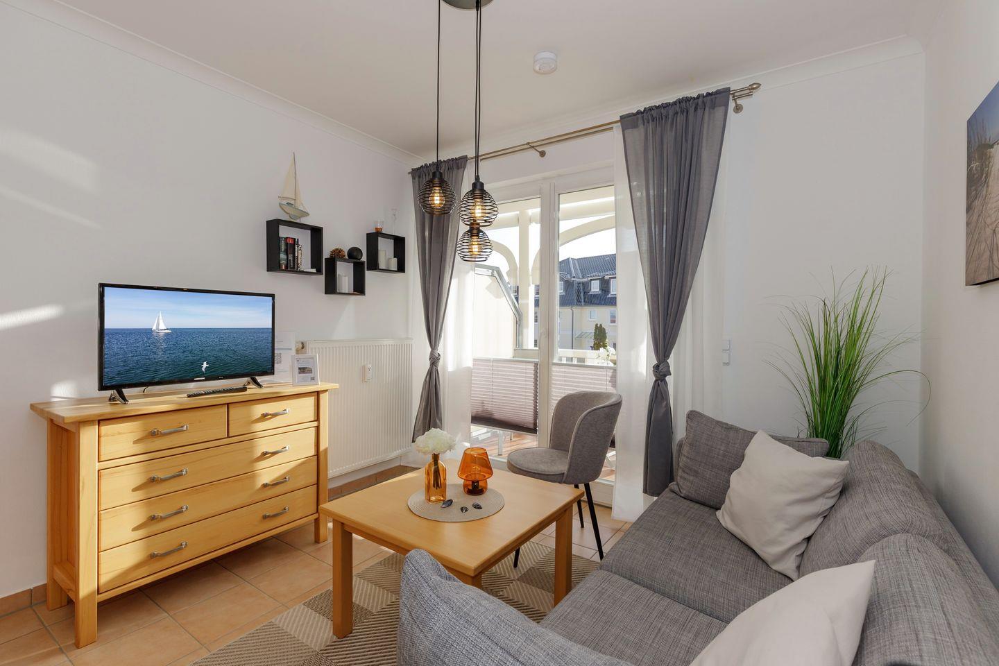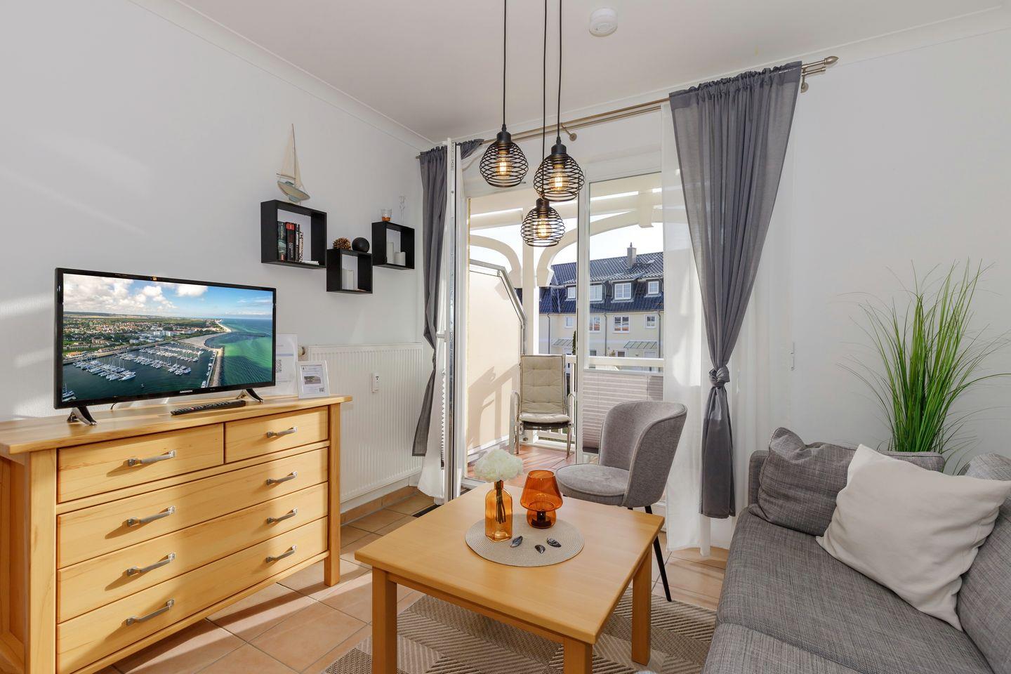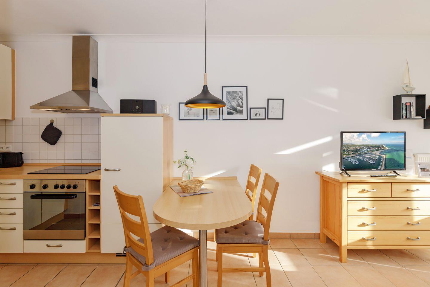 Das gemütliche Nichtraucher-Apartment verfügt über kostenfreies WLAN und eine voll ausgestattete offene Küche mit einem Backofen, einem Toaster, einer Kaffeemaschine, einem Wasserkocher und einer Geschirrspülmaschine. Im kombinierten Wohn- und Essbereich steht euch ein Flachbild-TV zur Verfügung. Sowohl der Esstisch, als auch der behagliche Sitzbereich bieten genügend Platz, um schöne Stunden beim Frühstück oder nach einem ereignisreichen Tag am Strand zu verbringen. Das separate Schlafzimmer ist ausgestattet mit einem großen Doppelbett (2 x 0,90 x 2,00) . Ein Kinderbett kann gegen Entgelt aufgestellt werden und auf Wunsch könnt ihr eine Kleinkindausstattung hinzubuchen. Auf dem südlich gelegenen Balkon genießt ihr den ganzen Tag das milde Ostseeklima und die Sonne.