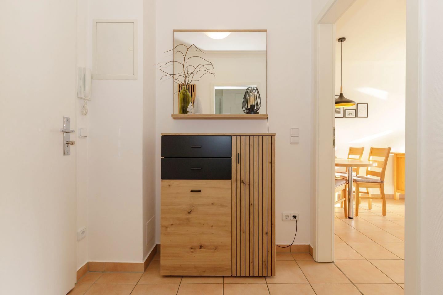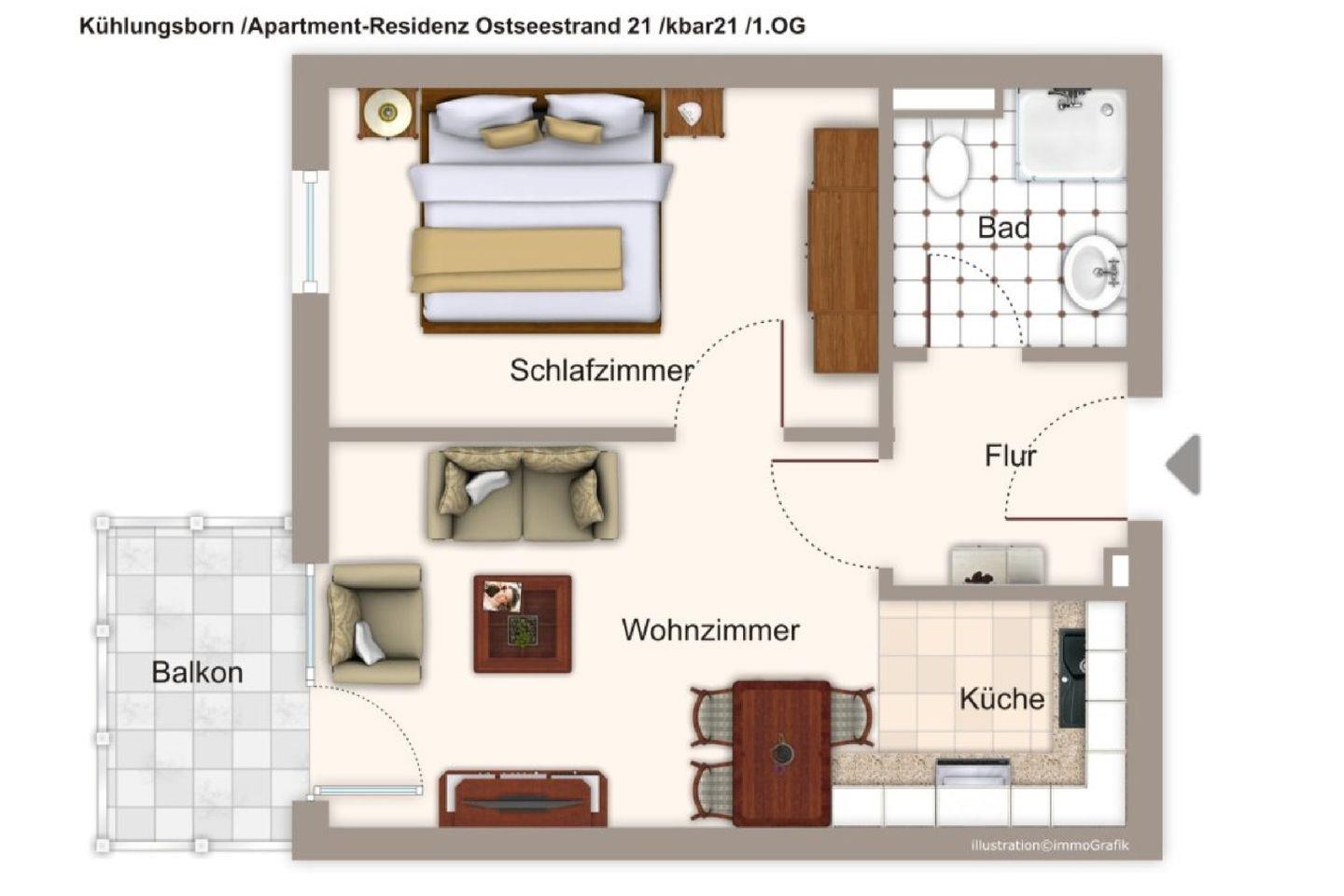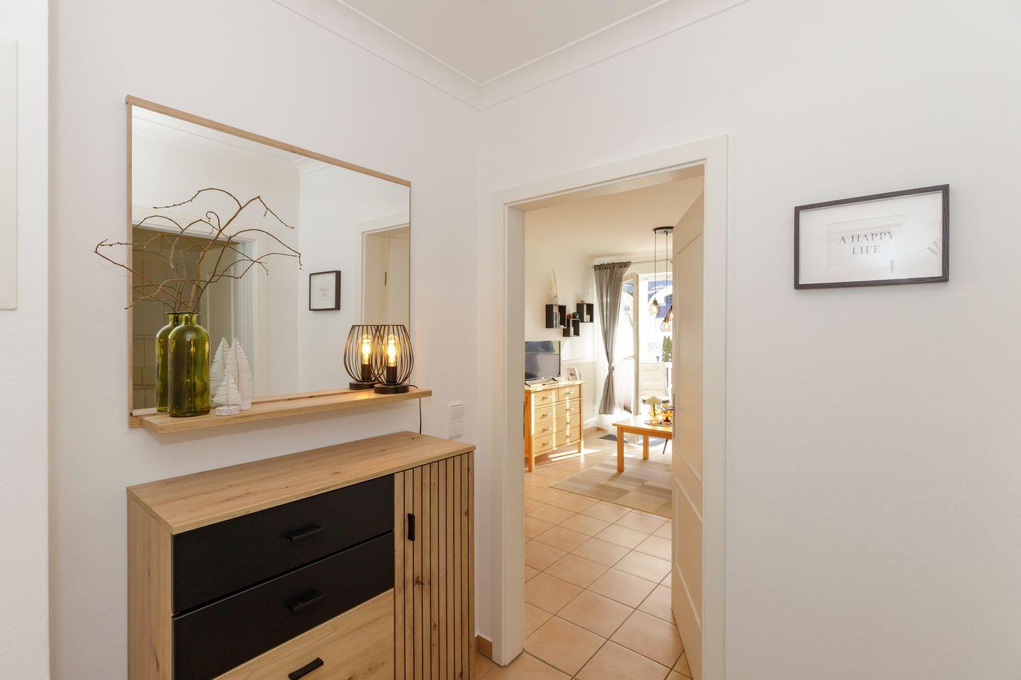 Das gemütliche Nichtraucher-Apartment verfügt über kostenfreies WLAN und eine voll ausgestattete offene Küche mit einem Backofen, einem Toaster, einer Kaffeemaschine, einem Wasserkocher und einer Geschirrspülmaschine. Im kombinierten Wohn- und Essbereich steht euch ein Flachbild-TV zur Verfügung. Sowohl der Esstisch, als auch der behagliche Sitzbereich bieten genügend Platz, um schöne Stunden beim Frühstück oder nach einem ereignisreichen Tag am Strand zu verbringen. Das separate Schlafzimmer ist ausgestattet mit einem großen Doppelbett (2 x 0,90 x 2,00) . Ein Kinderbett kann gegen Entgelt aufgestellt werden und auf Wunsch könnt ihr eine Kleinkindausstattung hinzubuchen. Auf dem südlich gelegenen Balkon genießt ihr den ganzen Tag das milde Ostseeklima und die Sonne.