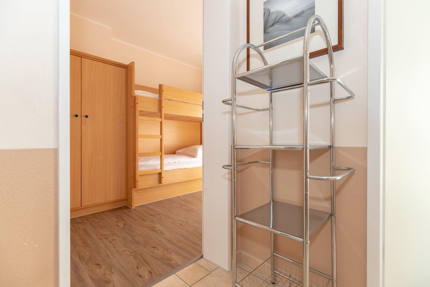 Das allergikerfreundliche Apartment mit kostenfreiem WLAN bietet Platz für 6 Personen und ist besonders bei Familien mit Kindern beliebt. Ein Schlafzimmer mit Doppelbett, eines mit Etagenbett und eine Doppelschlafcouch (1,40 x 2,00 m)im Wohnzimmer können durch ein Kinderbett gegen Entgelt (Hochstuhl gegen Aufpreis möglich) ergänzt werden. Die Schlafzimmer sind mit Vinylboden ausgestattet, die Kopfkissen mit Daunen gefüllt.