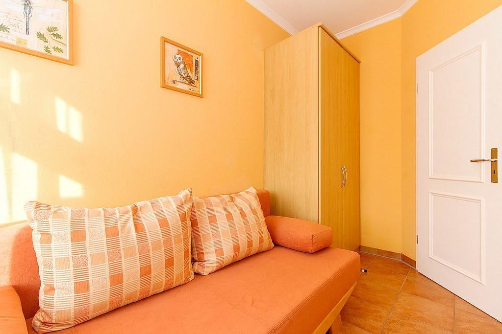 Das Nichtraucher-Feriendomizil verfügt über kostenfreies WLAN und ist mediterran eingerichtet. Es besteht aus einem Schlafzimmer mit Doppelbett (2 x 80 x 2,00 m), einem Kinderzimmer mit Couchliege (1,40 m x 2,00 m), einem Wohnbereich, einem Bad mit Dusche und aus einem sonnigen Balkon mit Blick zum Stadtwald.