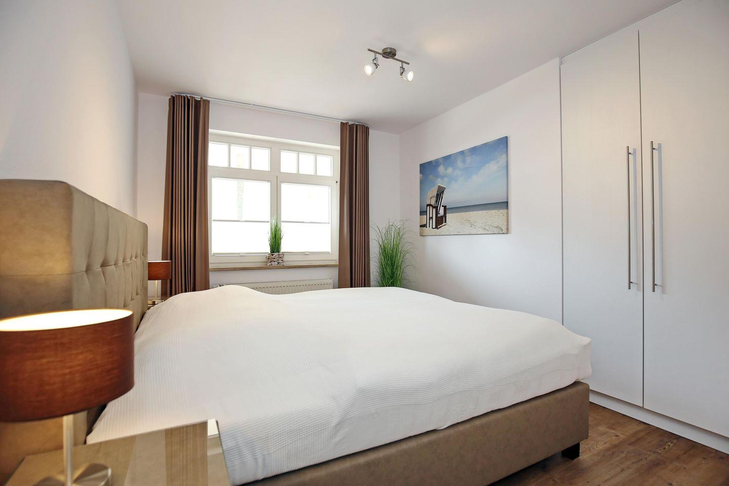In dem Schlafzimmer der Ferienwohnung lädt ein gemütliches Doppelbett (2 x 90 x 200 cm) zum ausgedehnten Schlaf ein. Für deine Urlaubsbekleidung findest du in dem Kleiderschrank und den Nachtkommoden genügend Stauraum. Die Vorhänge an den Fenstern dienen dir zur Verdunklung.
