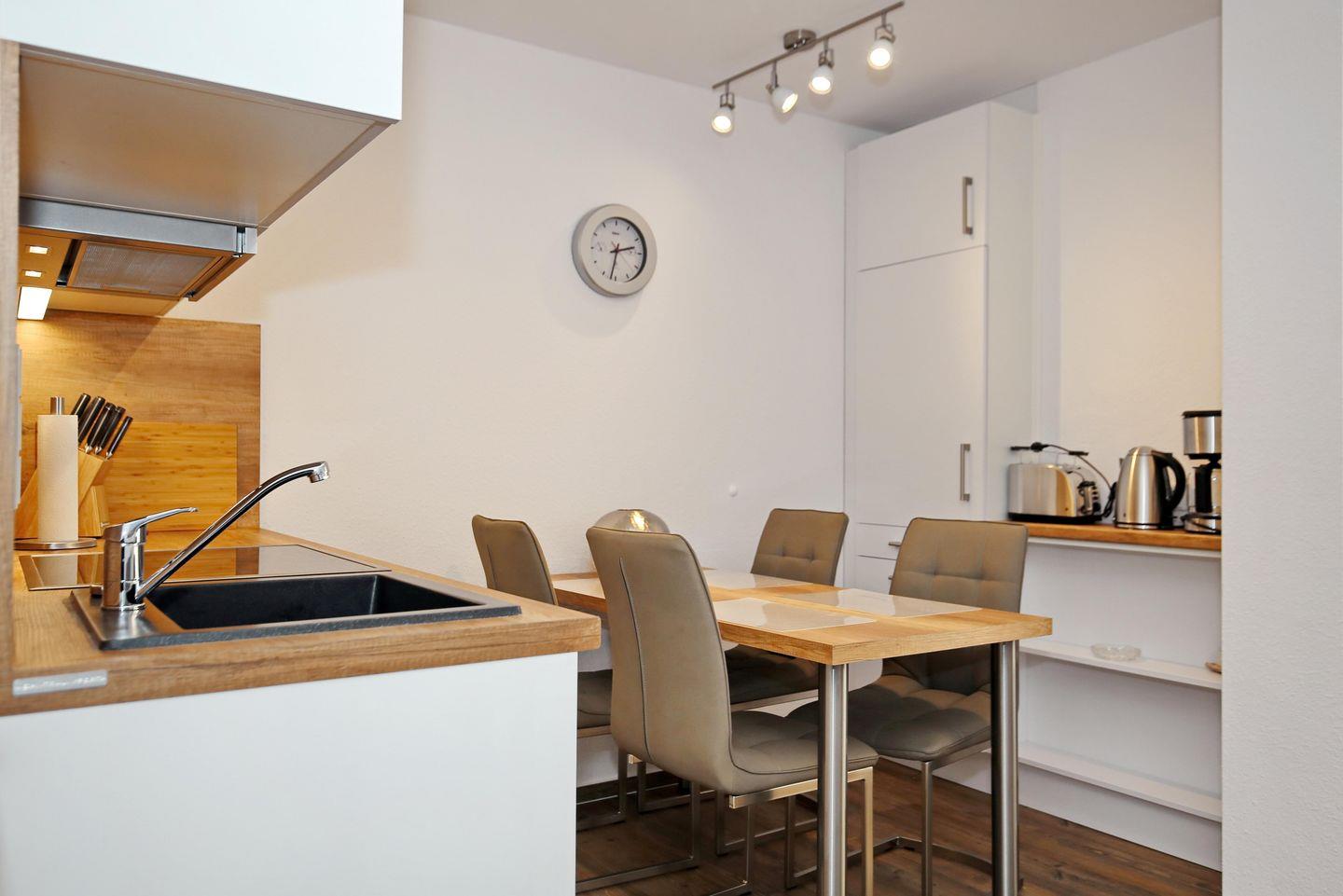 Die angrenzende offene Küchenzeile ist mit einem Kühlschrank mit Gefrierfach, einem Geschirrspüler, einem 4-Platten-Cerankochfeld und einem Backofen mit integrierter Mikrowelle voll ausgestattet. Vervollständigt wird die Ausstattung der Küche durch einen Toaster, einen Wasserkocher und eine Kaffeemaschine. Am Esstisch hast du genügend Platz für gemeinsame Mahlzeiten.