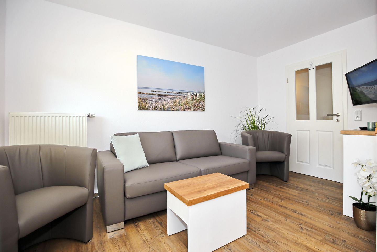 Der Wohnraum der Ferienwohnung bietet dir mit einer gemütlichen Sitzecke, einer Schlafcouch (160 x 200 cm) und einem Sessel sowie einem modernen Flachbild-TV pure Entspannung. Von hier aus gelangst du auf den Balkon zur Westseite.