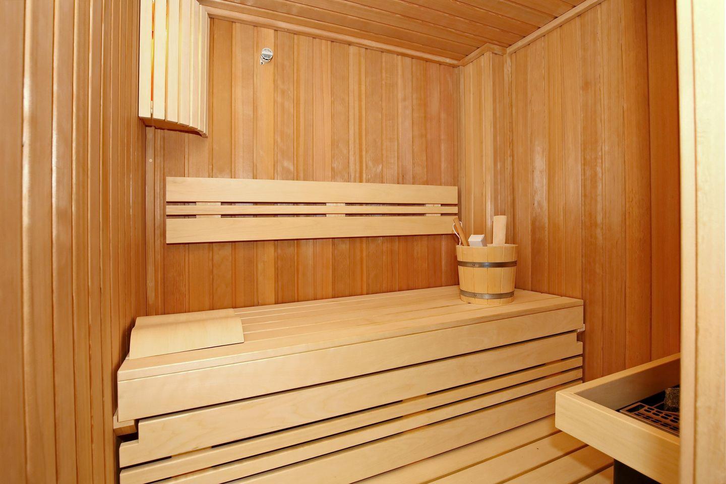 Die beiden Bäder sind modern gestaltet und verfügen jeweils über eine ebenerdige Dusche, ein WC, beleuchtete Spiegel und Kosmetikspiegel sowie einen Föhn. In einem der Bäder befindet sich ein Kombinationsgerät aus Waschmaschine und Trockner. Die Sauna ist in den Flur integriert und wird durch Münzeinwurf (30 Minuten kosten 1,00 €) betrieben.