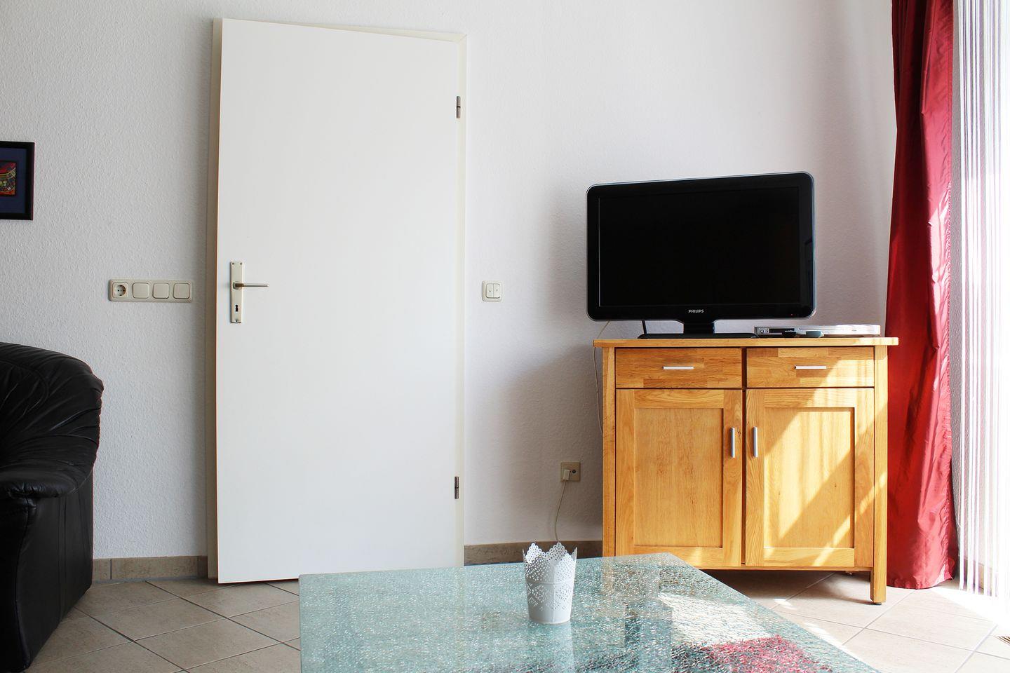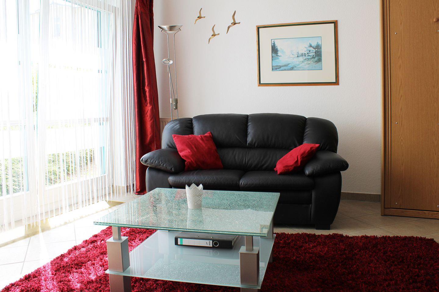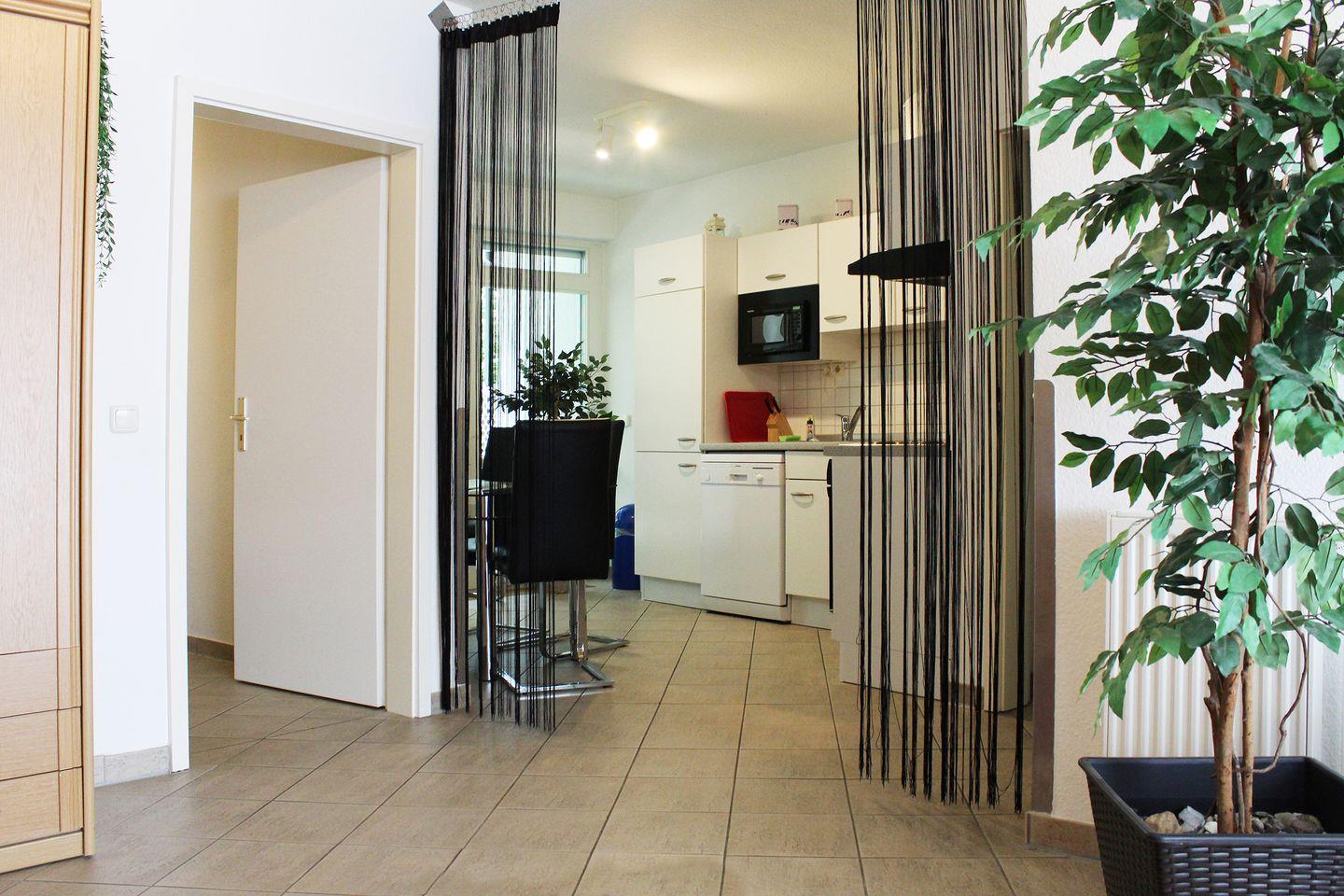 2 Zimmer, EG, 60 m², alle Fußböden sind gefliest, Küche mit E-Herd, Mikrowelle, Geschirrspüler und Essplatz, Bad mit Dusche und Waschmaschine, Farb-TV und DVD im Wohnzimmer, Doppelbett im Schlafzimmer, Wohnzimmer mit gemütlicher Sitzecke und 3 separaten Einzelschrankbetten. Safe vorhanden. kostenloses W-Lan. Terrasse, PKW - Tiefgaragenstellplatz, Fahrradabstellraum im Keller. Kinderspielplatz im Innenhof.