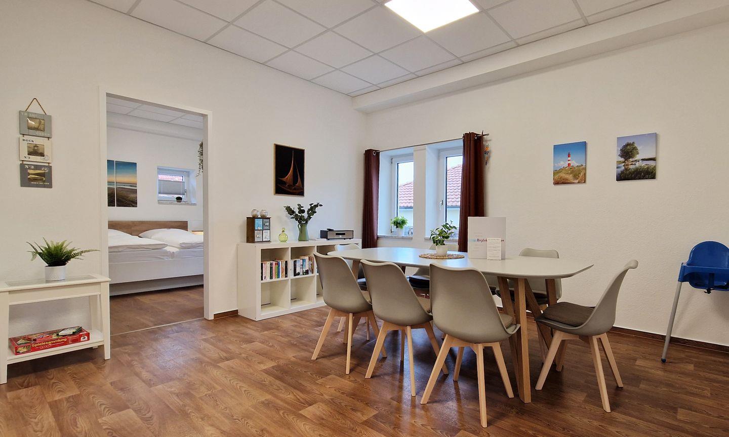 Am großen Tisch im Essbereich finden alle Platz, egal ob zum Frühstück, Abendbrot oder Spieleabend.