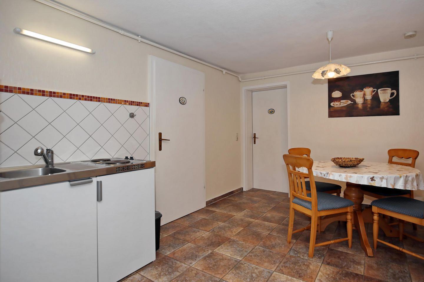 Der Wohnbereich der Ferienwohnung ist mit einem gemütlichen Sofa, einem Sessel und einem Flachbild-TV eingerichtet. Es steht dir kostenfrei WLAN zur Verfügung (ohne Gewähr). Im Küchenbereich stehen dir ein Kühlschrank mit Gefrierfach, ein 2-Platten-Kochfeld, eine Mikrowelle, eine Kaffeemaschine, ein Wasserkocher und ein Toaster zur Verfügung. Am Esstisch ist Platz für bis zu 3 Personen.