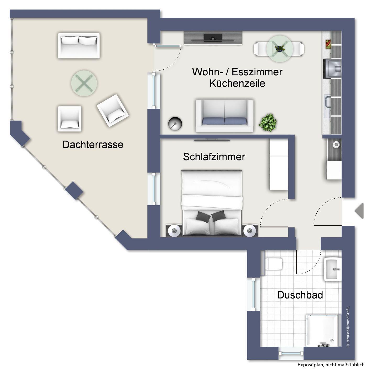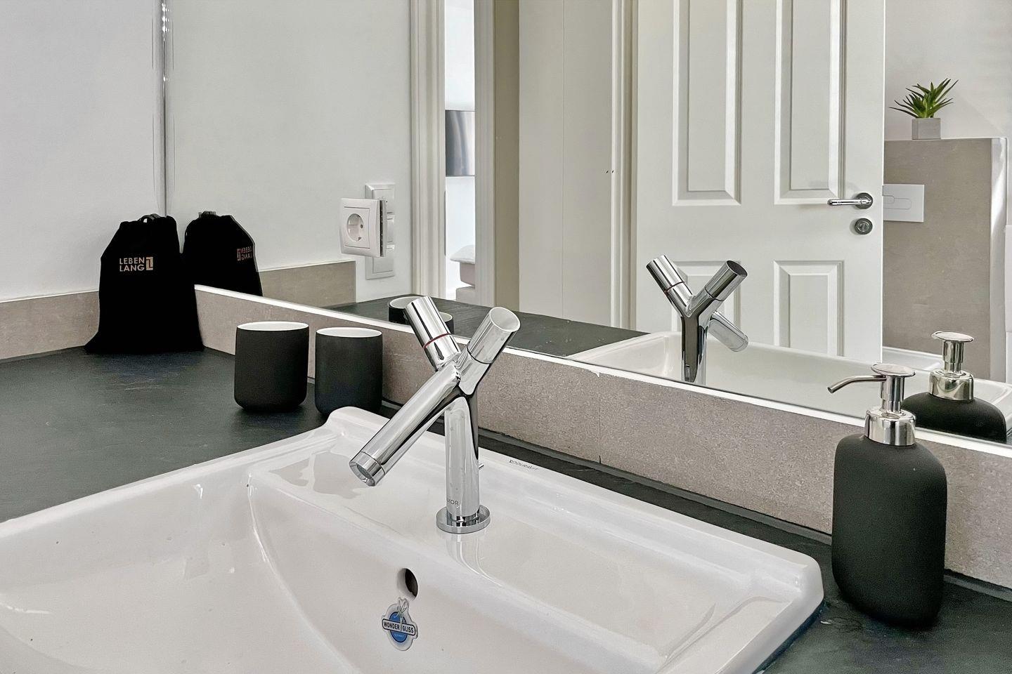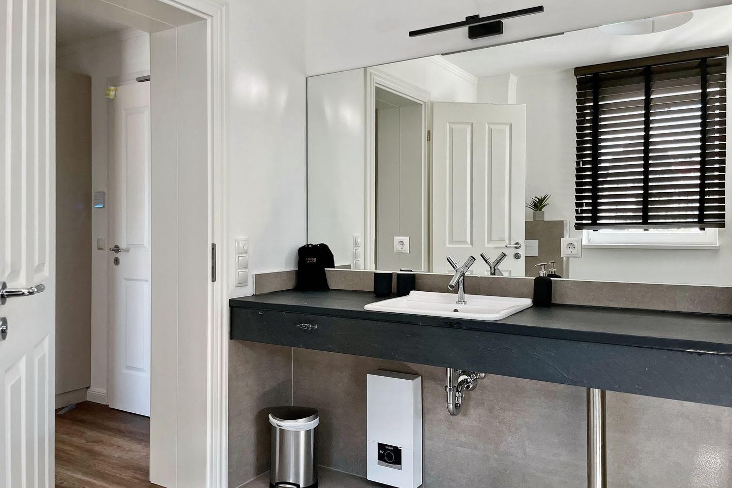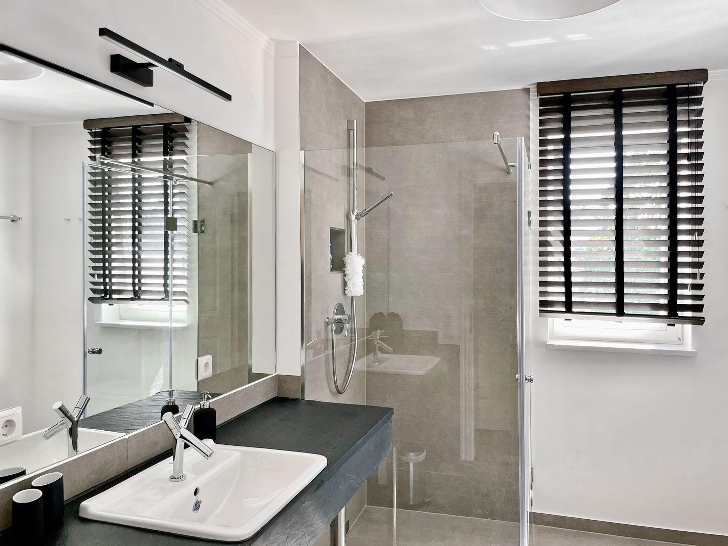 Der Wandschrank im Flur bietet dir ausreichend Stauraum. Das Tageslichtbad mit ebenerdiger Dusche ist mit einem großzügigen Waschtisch und einem Föhn ausgestattet.