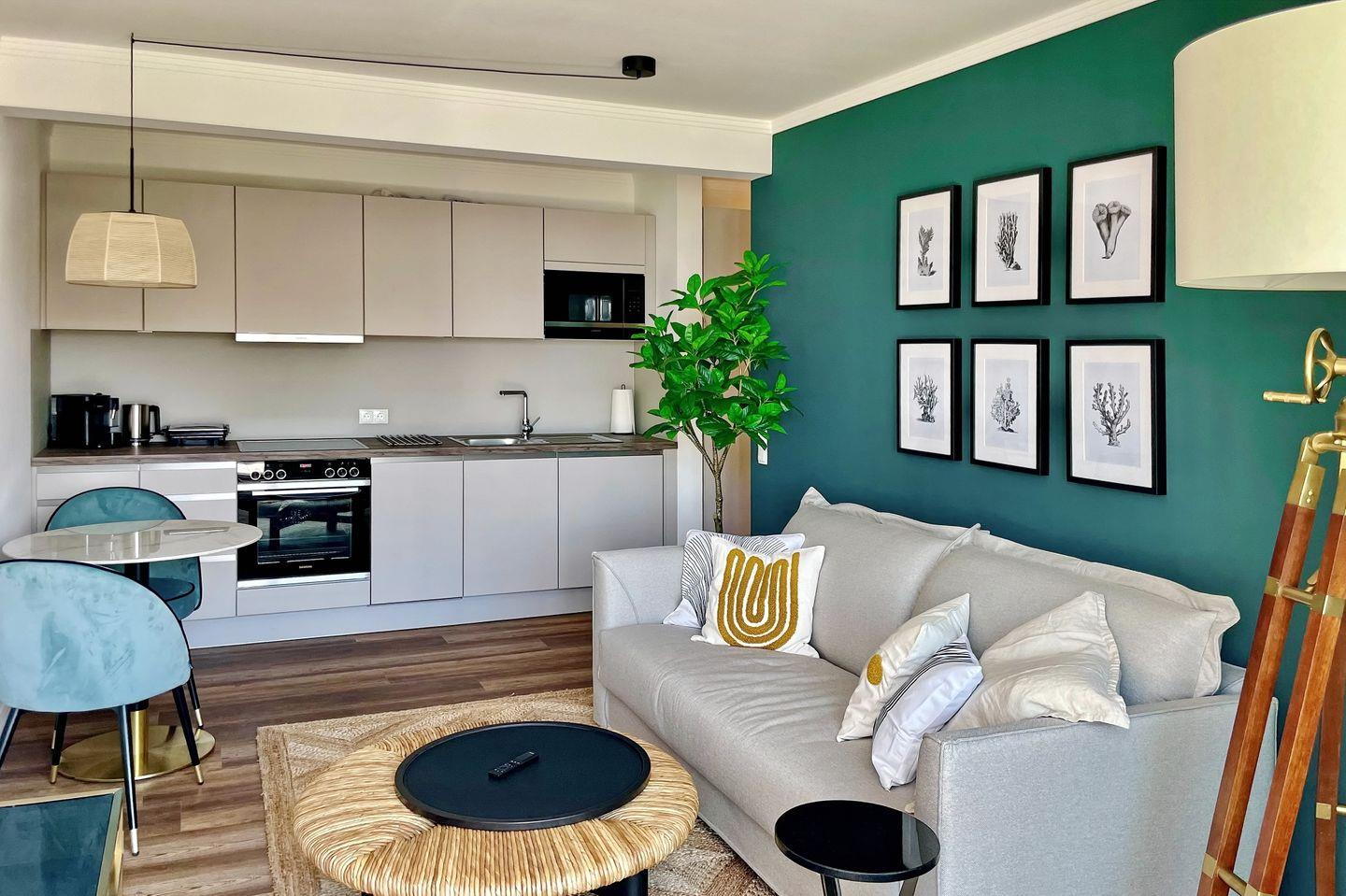 Der großzügige Nord-West Balkon verläuft vom Wohnzimmer bis zum Schlafzimmer. Der Balkon ist mit geschmackvollen Loungemöbel ausgestattet und lädt für entspannte Abende mit direktem Meerblick ein.