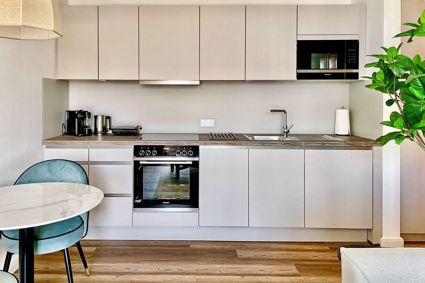 Die angrenzende ansprechende, offene Küchenzeile ist mit einem Kühlschrank mit Gefrierfach, einem Geschirrspüler, einem 4-Platten-Cerankochfeld, einer Mikrowelle und einem Backofen voll ausgestattet. Die Küchenausstattung wir komplettiert durch einen Toaster, eine Kaffeemaschine, eine Espressomaschine (Nespresso) und einen Wasserkocher.