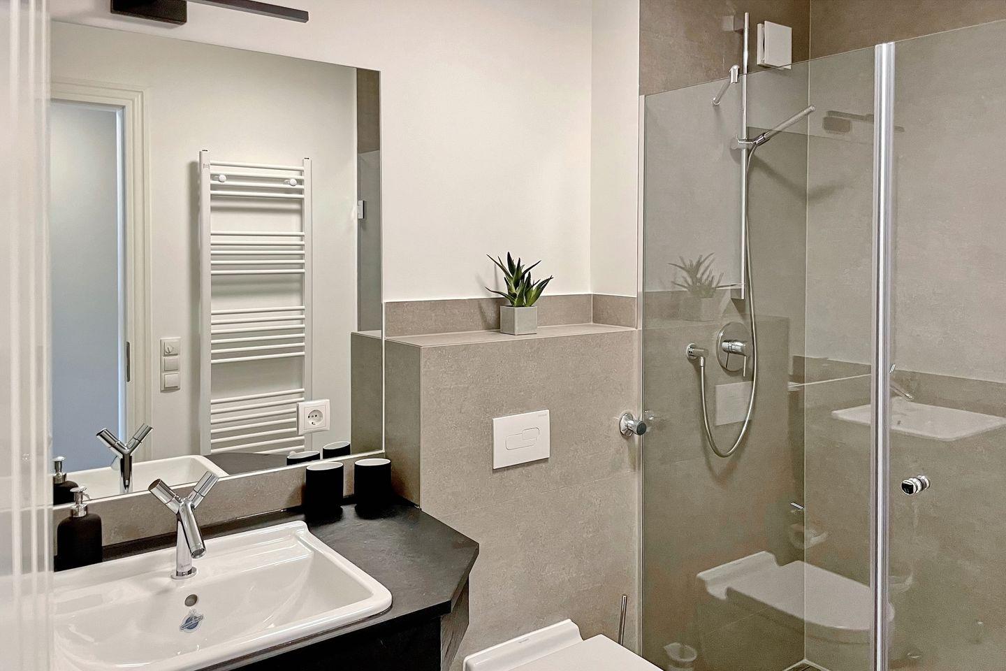 Der offene Wandschrank im Flur bietet dir ausreichend Stauraum. Das Badezimmer mit ebenerdiger Dusche ist mit einem großzügigen Waschtisch und einem Föhn ausgestattet.