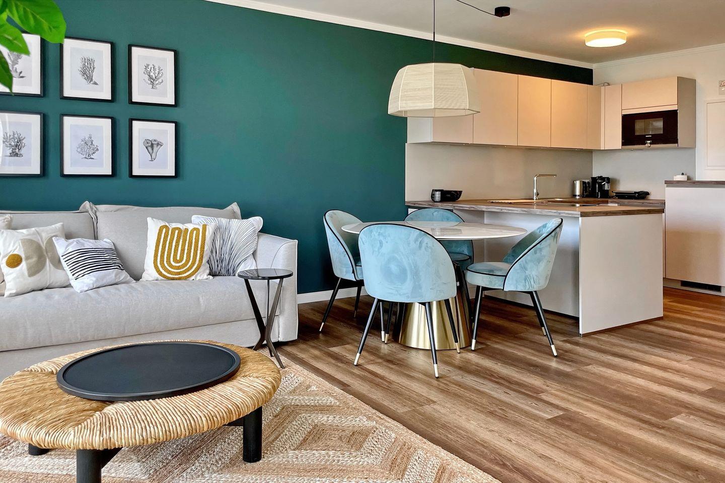 In diesem luxuriösen Penthouse ca. 62m² wird eine hochwertige Ausstattung großgeschrieben. Das moderne 2-Zimmer-Penthouse mit Nord-Ost-Ausrichtung befindet sich in der 2.Etage der Villa Siegfried und bietet bis zu 4 Personen einen erholsamen Urlaub an der Ostsee – nach nur ca. 50 Metern bist du direkt am Strand. Die Wohnung ist in einen Wohnbereich, einen kombinierten Ess- und Küchenbereich sowie einem Schlafzimmer und einem Tageslichtbad mit Dusche aufgeteilt. Auf dem großen Balkon kannst du entspannte Stunden mit einem wunderschönen Blick auf die Ostsee genießen.