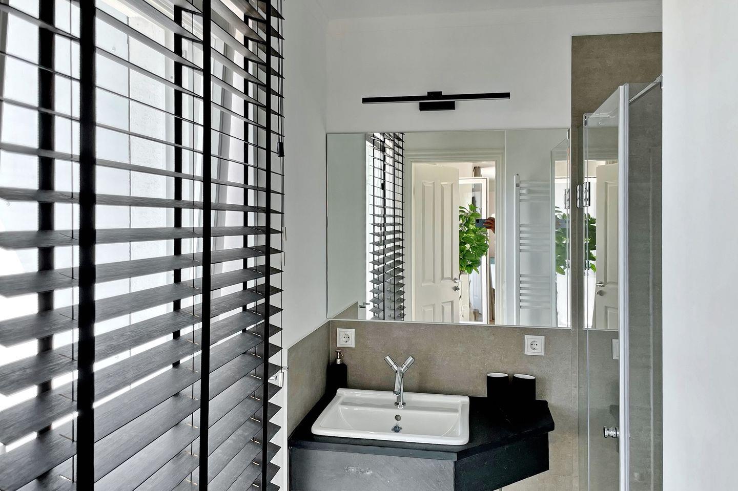 Das Tageslichtbad mit ebenerdiger Dusche ist mit einem großzügigen Waschtisch und einem Föhn ausgestattet.