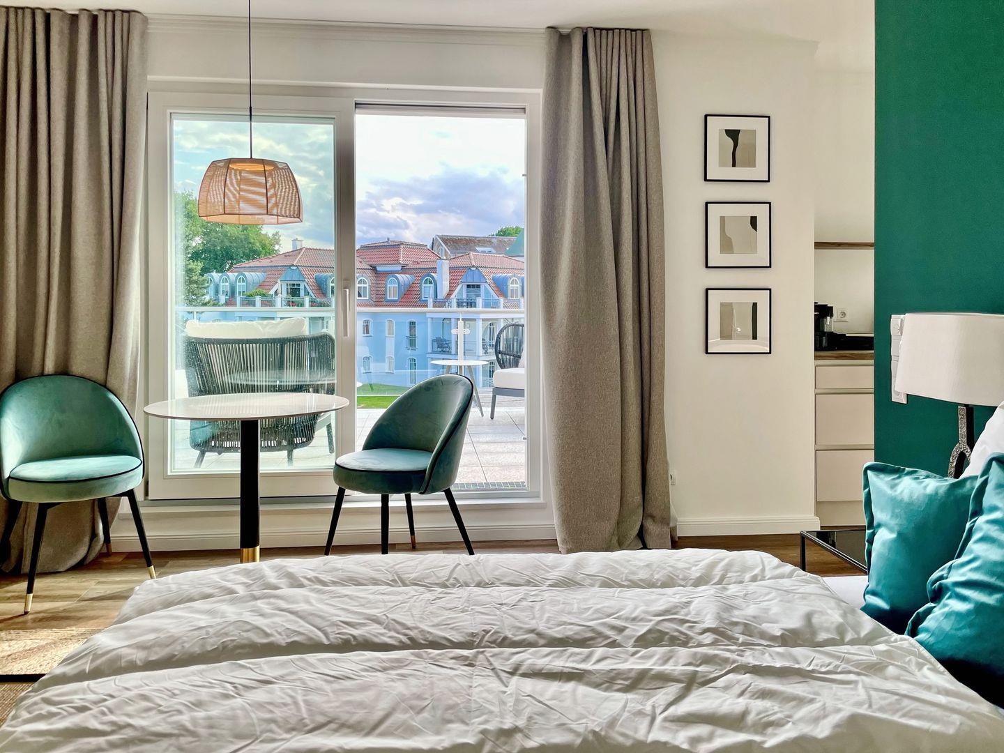 Der stilvolle Wohn- / Schlafbereich des Penthouses lädt dich mit mit einem komfortablen Boxspringbett (2 x 90 cm x 200 cm) der Marke Schramm für angenehme Nachtruhe ein, zwei Sessel und einem 65 Zoll Samsung 4K Flachbild-TV zu geselligen Abendstunden ein. Der Essbereich ist im Wohnbereich integriert und bietet dir Platz für gemeinsame Mahlzeiten.