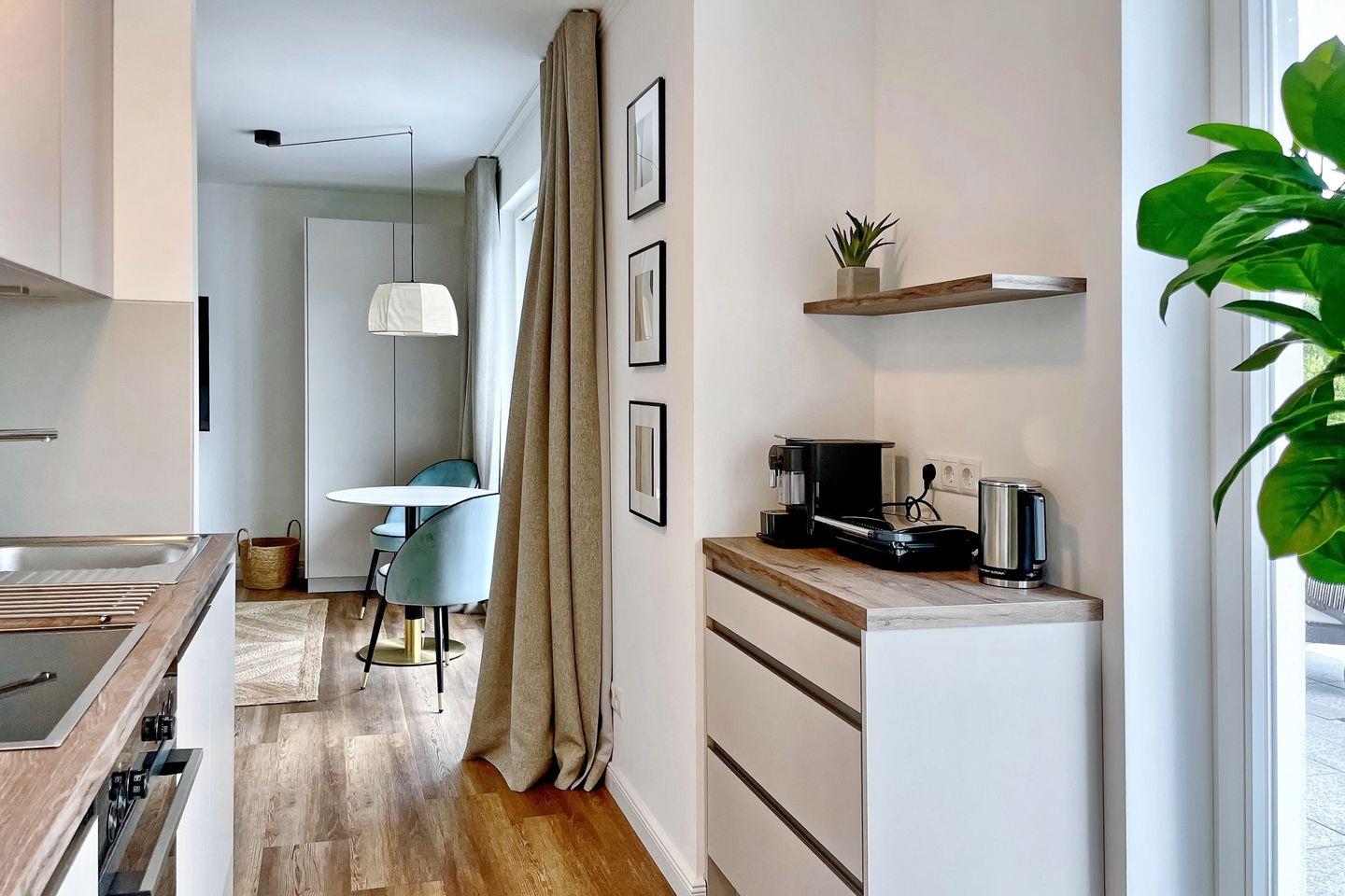 Die angrenzende offene und moderne Küchenzeile ist mit einem Kühlschrank mit Gefrierfach, einem Geschirrspüler, einem 4-Platten-Cerankochfeld, einer Mikrowelle und einem Backofen voll ausgestattet. Die Küchenausstattung wird komplettiert durch einen Toaster, eine Kaffeemaschine, eine Espressomaschine (Nespresso) und einen Wasserkocher.