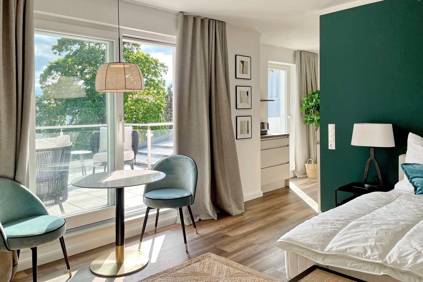 In diesem mondänen Penthouse mit einer Größe von ca. 47m² wird eine stilvolle und gemütliche Atmosphäre durch eine hochwertige Ausstattung großgeschrieben. Das moderne 1-Zimmer-Penthouse mit Süd-Ost-Ausrichtung befindet sich in der 2.Etage der Villa Siegfried und bietet bis zu 2 Personen einen erholsamen Urlaub an der Ostsee – nach nur ca. 50 Metern bist du direkt am Strand. Die Wohnung ist in einen Wohn-/ Schlafbereich, einen kombinierten Ess- und Küchenbereich sowie einem Tageslichtbad mit Dusche aufgeteilt. Auf der Süd-West-Dachterrasse kannst du entspannte Stunden genießen.