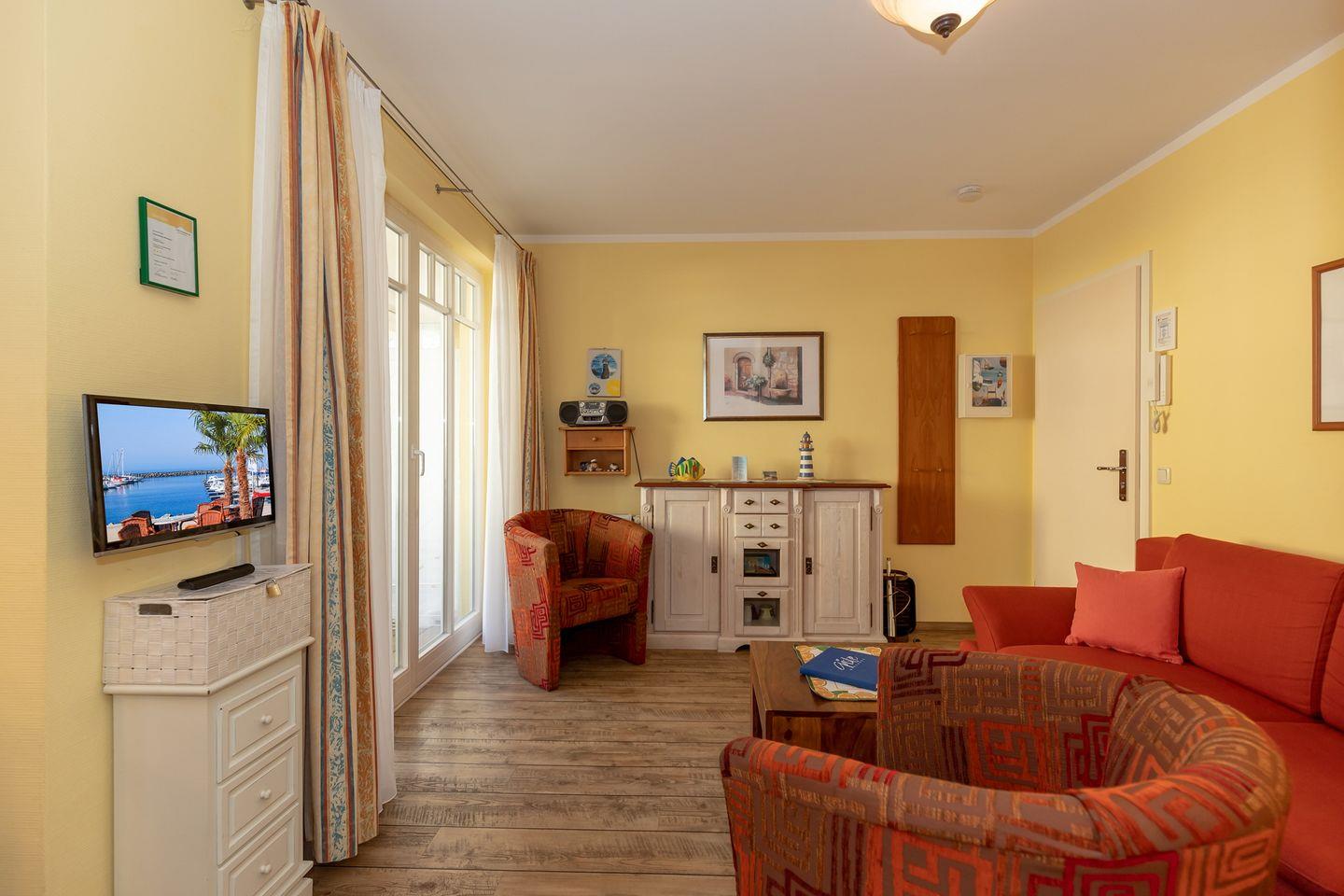 Die hübsche Wohnung verfügt über kostenfreies WLAN. Im kombinierten Wohn-Essbereich befinden sich die offene Küche mit Kühlschrank mit Tiefkühlfach, 4-Felder Ceranherd, Mikrowelle, Kaffeemaschine, Toaster, Mixer, Eier- und Wasserkocher sowie der angeschlossene Wohnbereich mit Doppelschlafcouch (1,60 x 2,10 m), SMART-TV (32 Zoll), CD-Player, Radio, Büchern und Gesellschaftsspielen. Das Badezimmer beinhaltet Dusche, Waschbecken, WC und Föhn. Das separate Schlafzimmer bietet euch ein komfortables Boxspring-Doppelbett in Überlänge (1,80 x 2,10 m), Kleiderschrank und einen SMART-TV (32 Zoll). Der Balkon zur Meerseite ist überdacht und mit Gartenmöbeln für 3 Personen ausgestattet - hier genießt ihr das wohltuende Klima der Ostsee. Der Balkon ist vom Wohnzimmer aus begehbar.