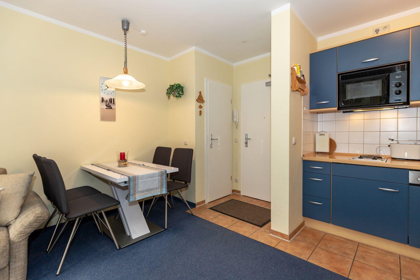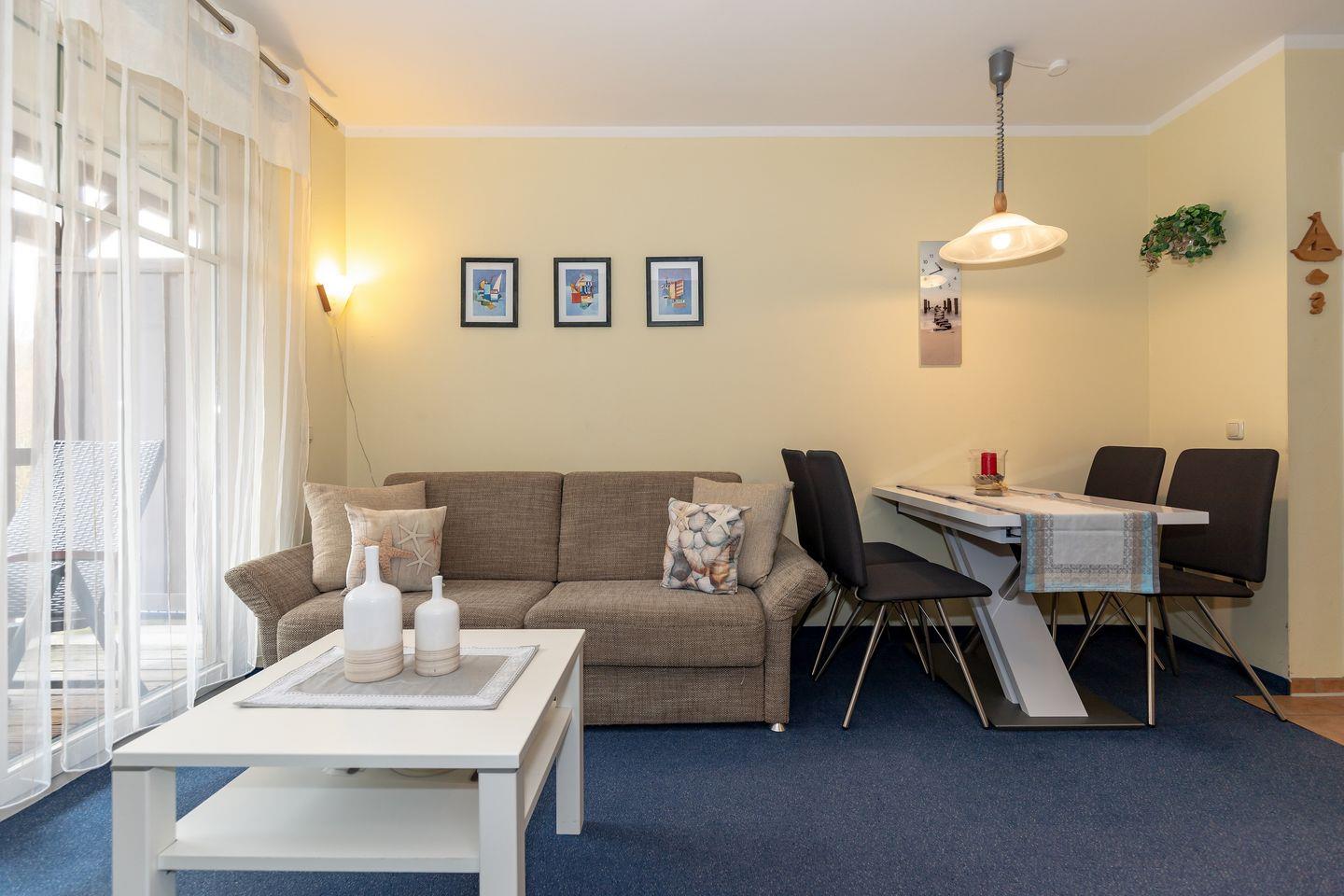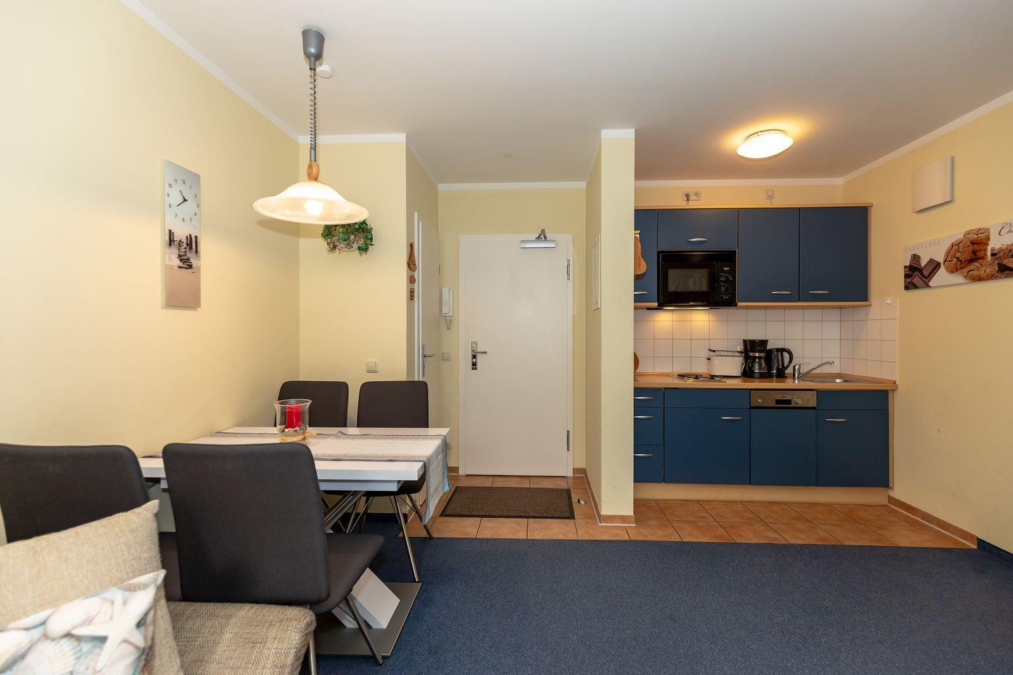 Das Nichtraucher-Apartment verfügt über kostenfreies WLAN und eine voll ausgestattete offene Küche mit Mikrowellen-Backofenkombination, Toaster, Kaffeemaschine, Wasserkocher, Geschirrspülmaschine, Kühlschrank mit Gefrierfach und 2- Plattenherd. Im kombinierten Wohn- und Essbereich stehen euch ein ein SMART-TV (40 Zoll), CD-Player, und CDs, Radio, Gesellschaftsspiele und eine Schlafcouch (1,50 x 1,90 m) zur Verfügung. Das Badezimmer verfügt über Dusche, WC, Waschtisch und Badhocker. Im Apartment findet ihr zudem Bücher für die Urlaubslektüre. Die Wohnung verfügt über ein separates Schlafzimmer mit Boxspringdoppelbett( 1,80 x 2,00 m) und über einen südlich gelegenen und überdachten Balkon mit Gartenmöbeln auf dem ihr das schöne Meeresklima in ruhiger Lage genießen könnt. Ein Kinderbett kann gegen Entgelt aufgestellt werden und auf Wunsch könnt ihr einen Hochstuhl hinzubuchen.