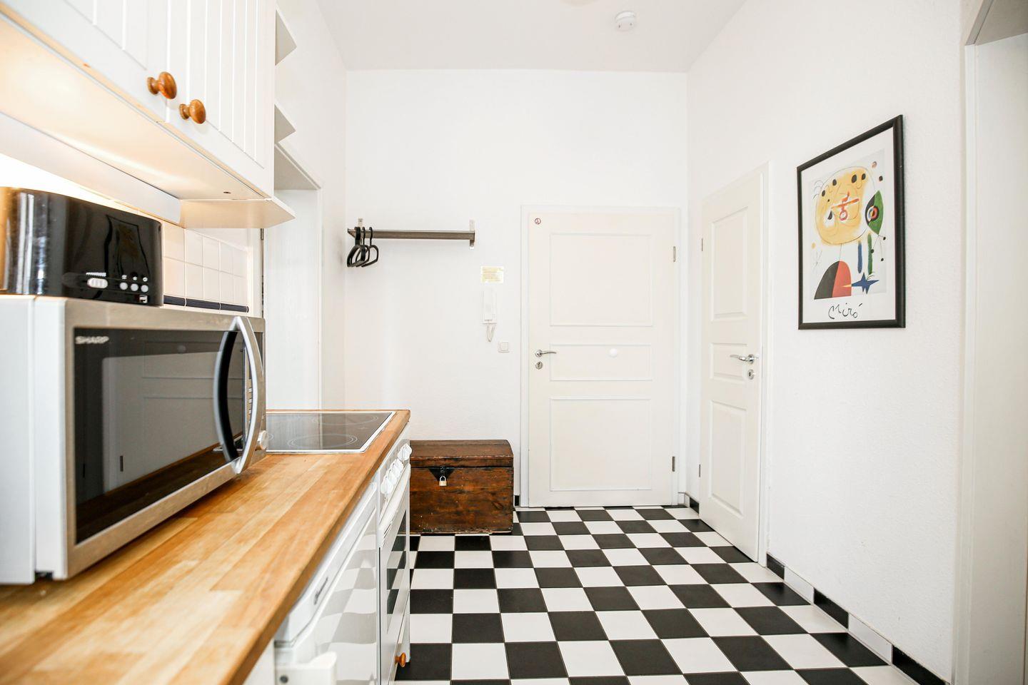 Die kleine separate Küche ist bis ins Detail ausgestattet. Neben einem Backofen, einem 4-Plattenherd, einem Wasserkocher, einem Toaster und einer Kaffeemaschine stehen dir diverse Kochutensilien zur Verfügung.