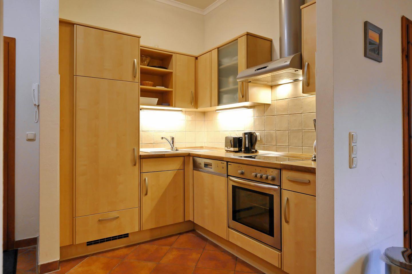 Die moderne Küchenzeile ist voll ausgestattet mit einem vierfachen Cerankochfeld, einem Backofen, einem Geschirrspüler und einem Kühlschrank mit Gefrierfach. Auch ein Wasserkocher, eine Kaffeemaschine und ein Toaster sind vorhanden.
