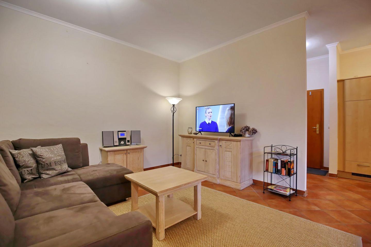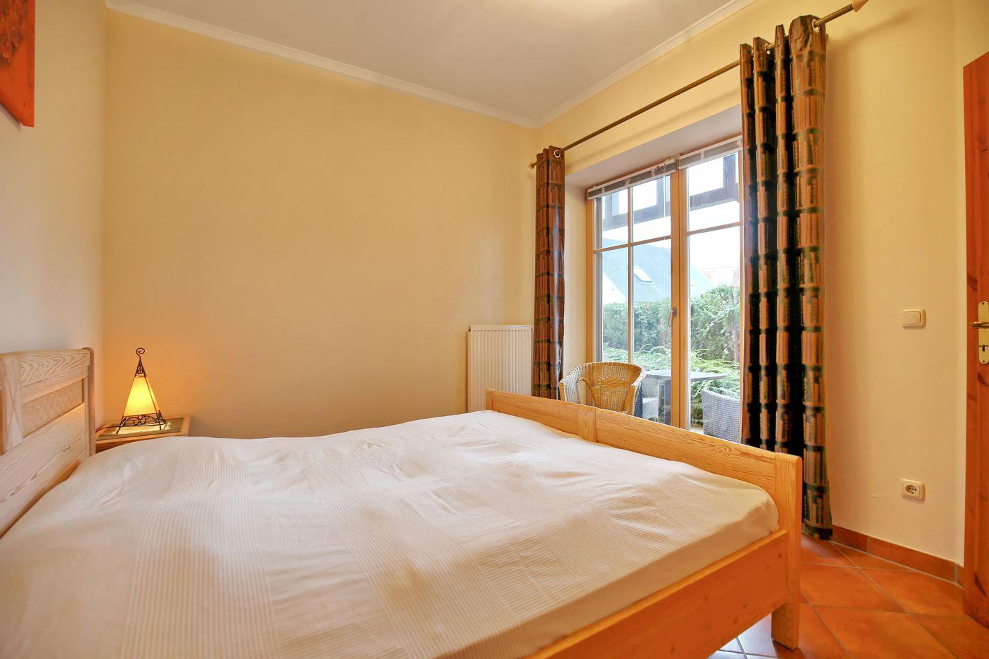Die 60 qm große 2-Zimmer-Wohnung liegt im Erdgeschoss und bietet eine großzügige, möblierte Terrasse mit West- Ausrichtung für entspannte Stunden. Die Wohnung besteht aus einem Wohn- und Essbereich, einer Küchenzeile, einem Schlafzimmer und einem Duschbad und bietet Platz für bis zu 4 Personen. Der Strand ist nur etwa 300 Meter entfernt und das Stadtzentrum erreichen Sie in ca. 5 Minuten.