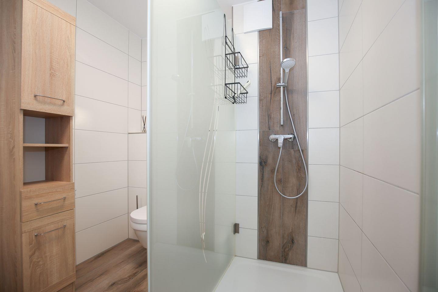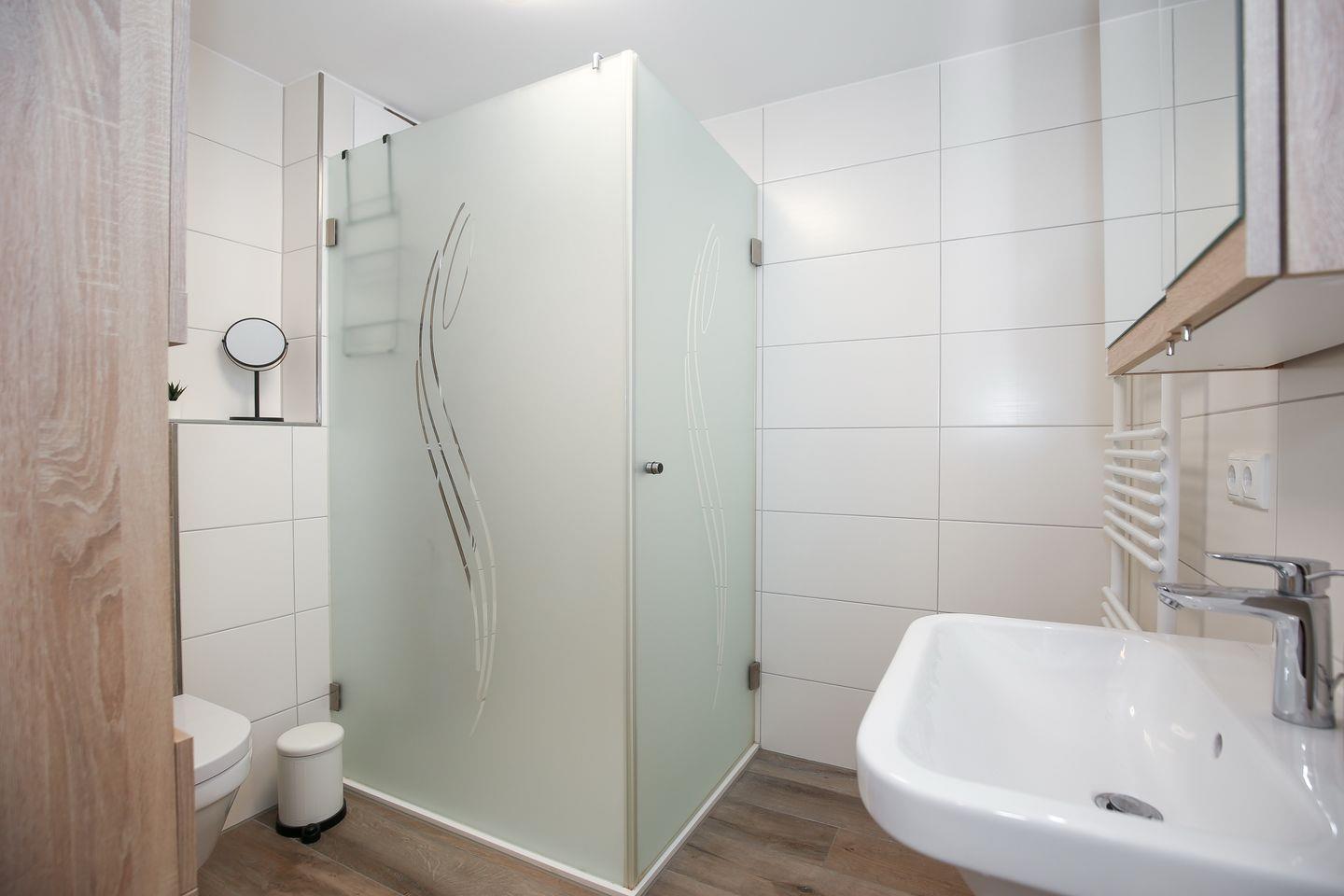 Das Badezimmer ist modern gestaltet und verfügt über eine ebenerdige Dusche, ein WC sowie einen Föhn.