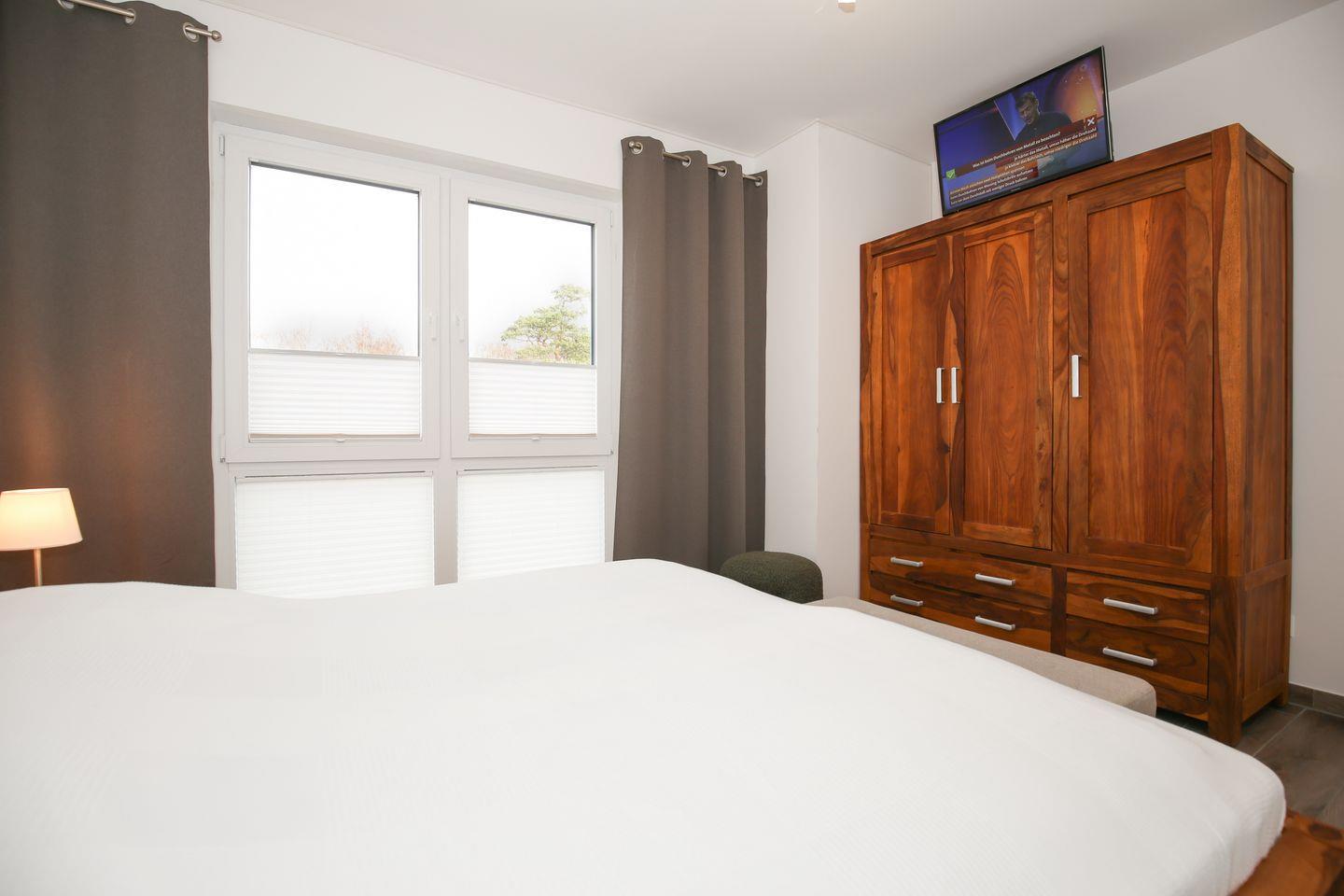 Im Schlafzimmer der Ferienwohnung empfängt Dich ein bequemes Doppelbett (2 x 90 cm x 200 cm) zur erholsamen Nachtruhe. Ein Kleiderschrank bietet Dir genügend Stauraum für dein Urlaubsgepäck. Ein Flachbild-TV sorgt für spätabendliche Unterhaltung.