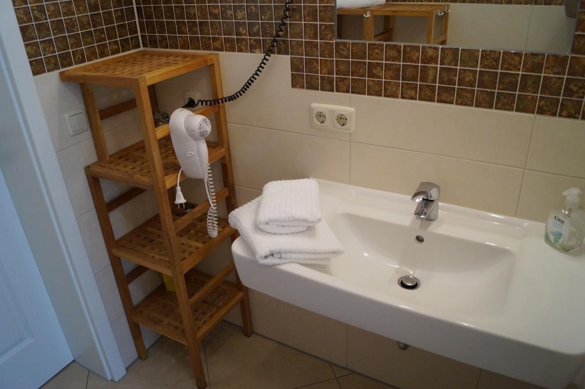 Das Tageslicht-Badezimmer ist mit Dusche, WC und Kosmetikspiegel ausgestattet. Die Fußbodenheizung sorgt für warme Füße im Winter.