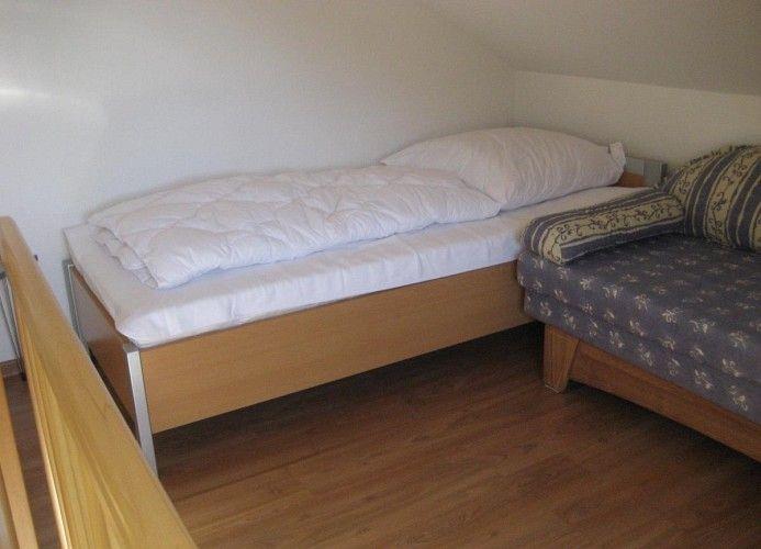 Es gibt ein separates Schlafzimmer mit Doppelbett. Zusätzliche Schlafmöglichkeiten befinden sich auf der Empore, die vom Wohnzimmer aus zu erreichen ist (Achtung! Schmale Treppe, für Kleinkinder daher nur bedingt geeignet).