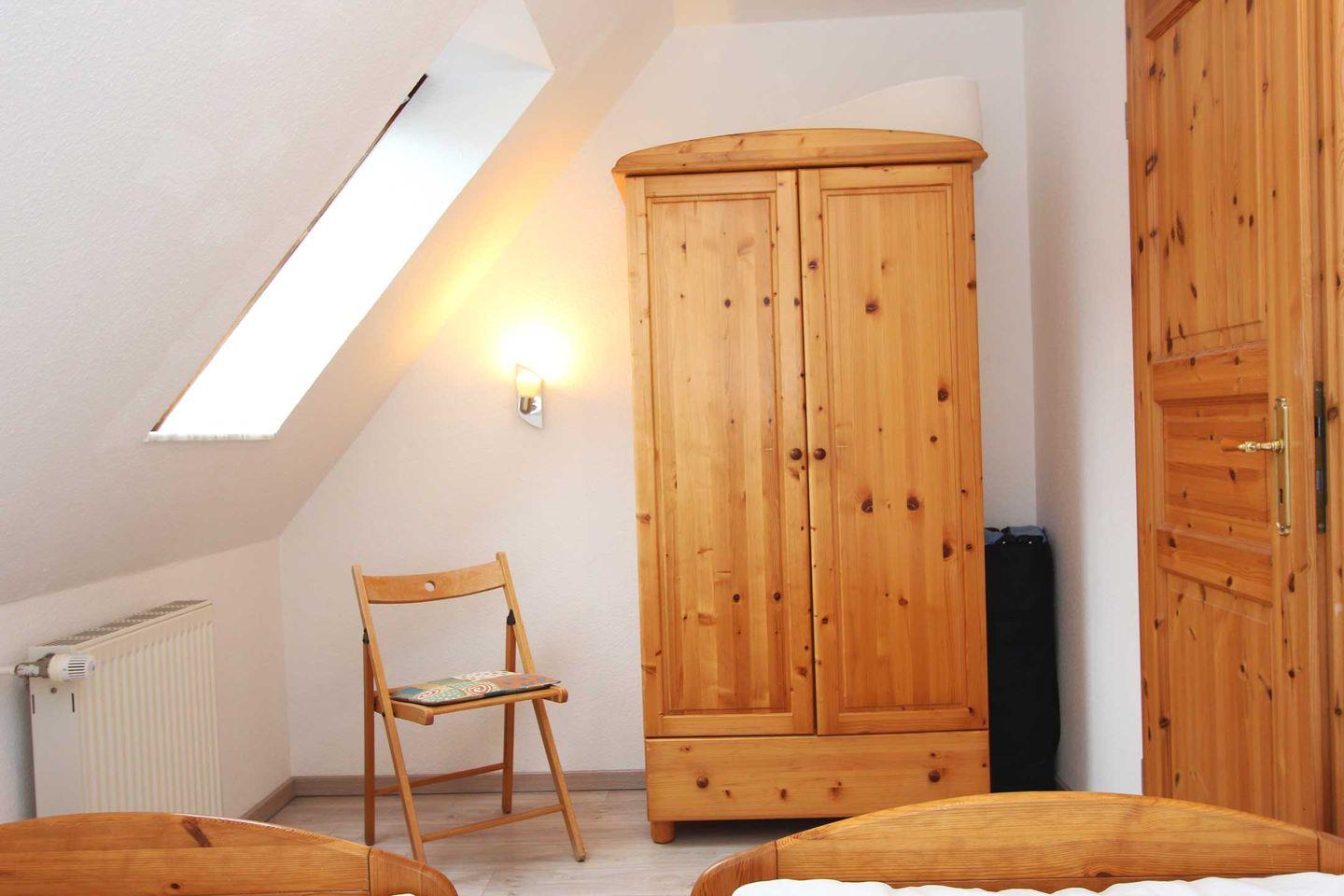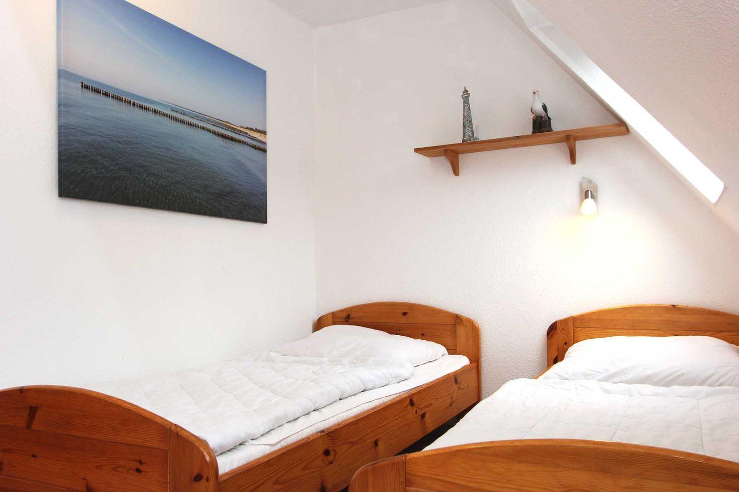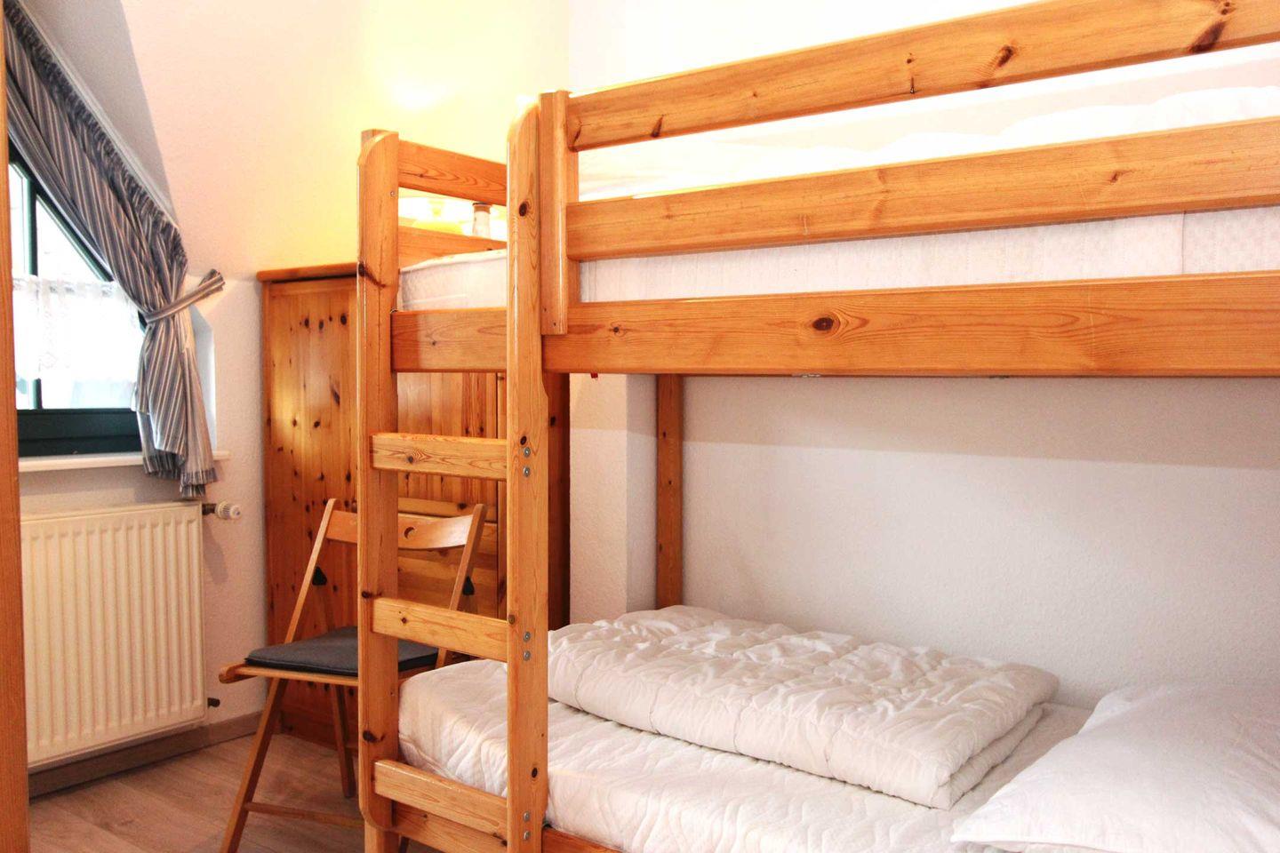 Über eine Treppe gelangen Sie in das Obergeschoss, welches über zwei Schlafzimmer verfügt. Das erste Schlafzimmer ist mit zwei Einzelbetten ausgestattet, das zweite mit einem Doppelstockbett. Ebenfalls im Obergeschoss befindet sich das Tageslicht-Duschbad und ein Balkon mit Südausrichtung.