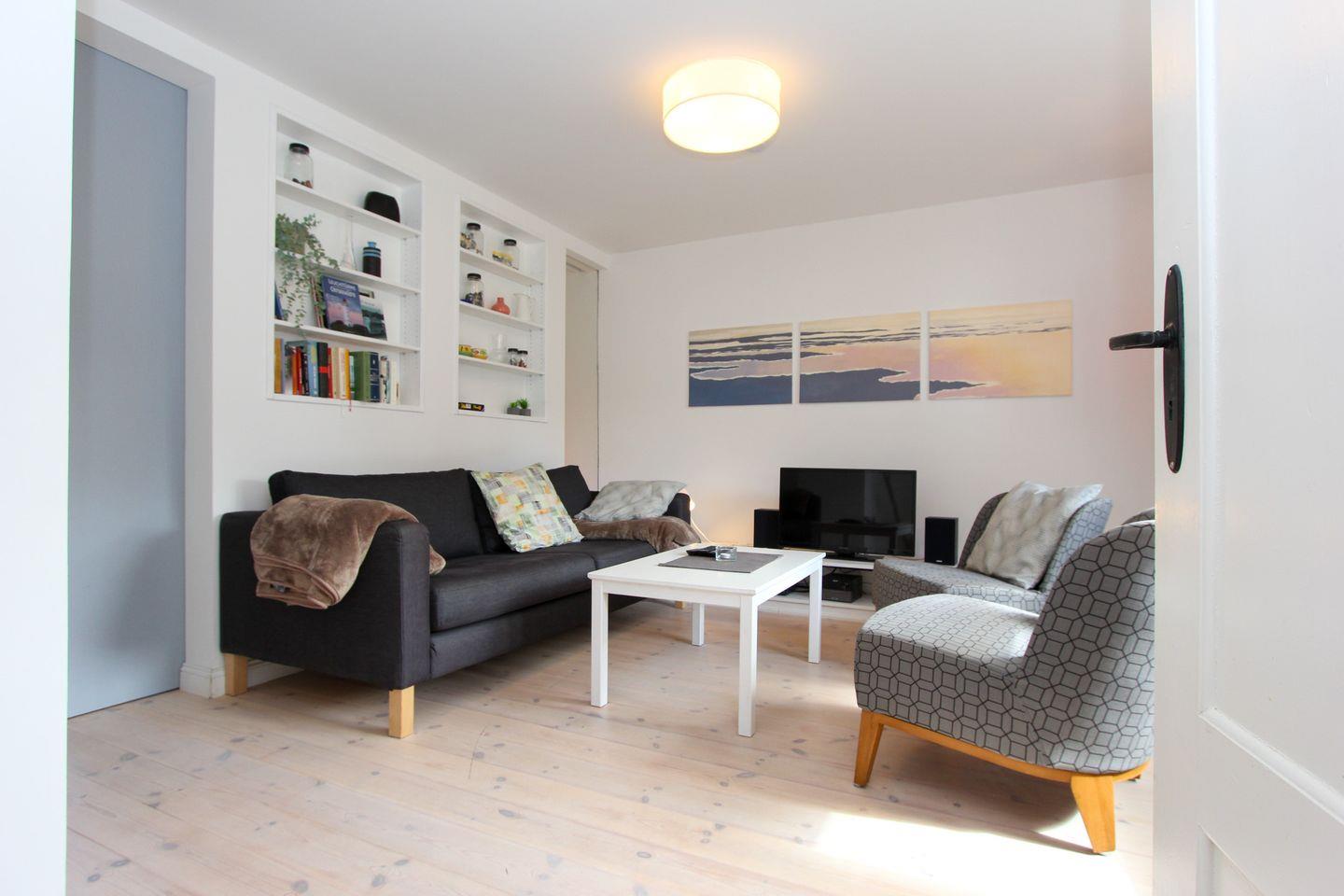 Anschließend gelangen Sie in den gemütlichen Wohnbereich, mit Fernsehcouch und Blick in den Garten. Von hier aus betreten Sie das erste Schlafzimmer mit Doppelbett und ausreichend Stauraum. Ein weiteres Schlafzimmer mit Einzelbett und ausziehbarem Bettkasten erwartet Sie angrenzend zum Ess- und Küchenbereich.