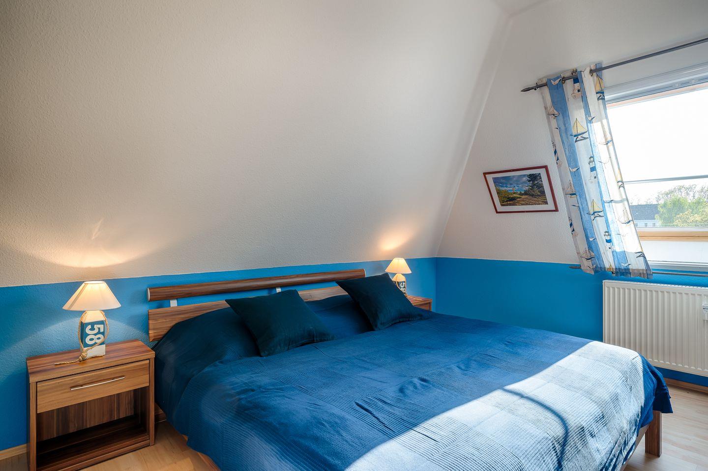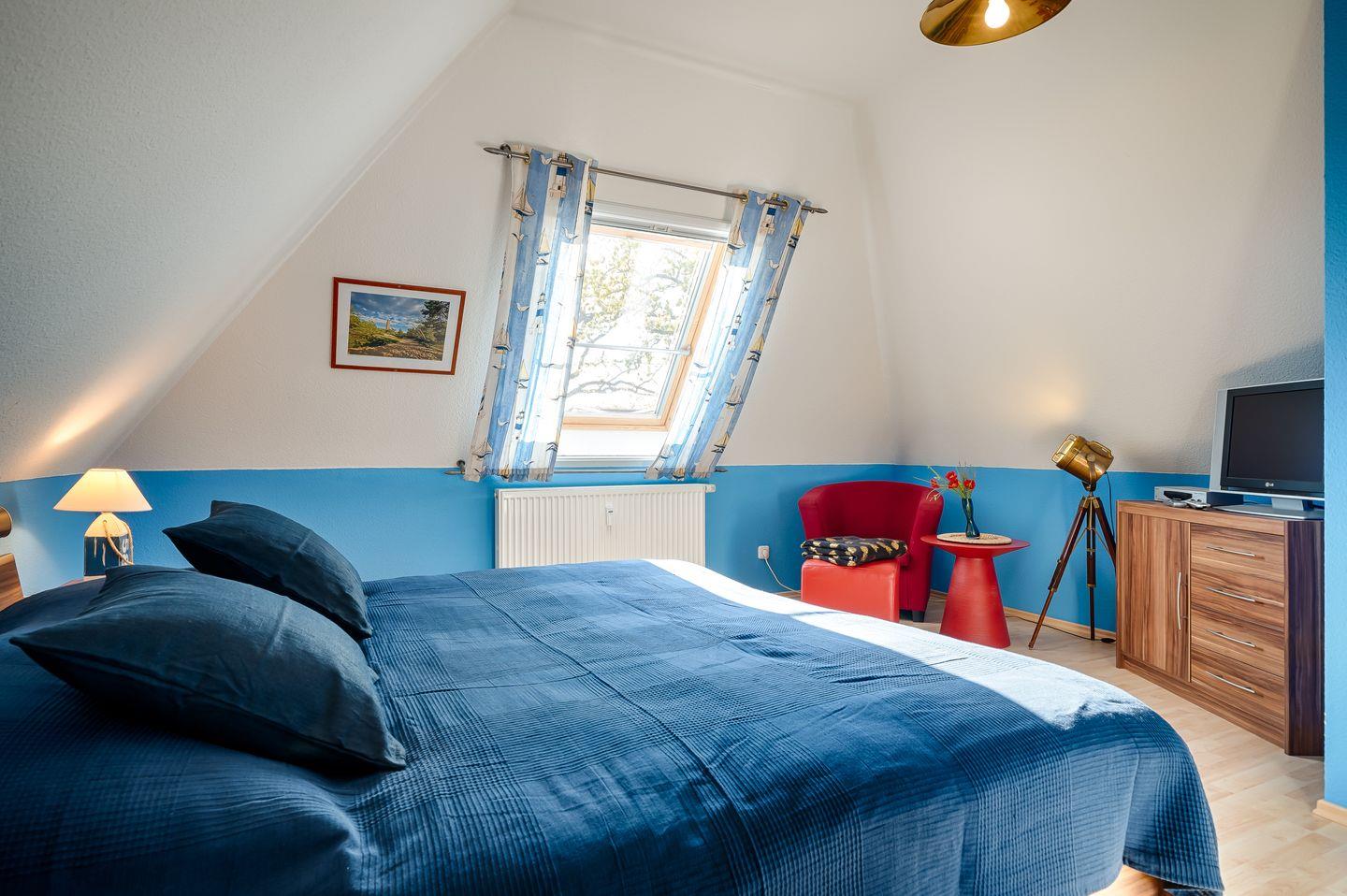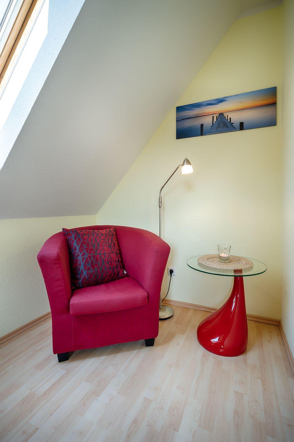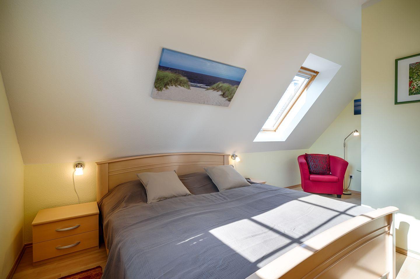 1 Schlafzimmer mit Doppelbett (1,80x2,00m), verstellbare Lattenroste und Lesesessel