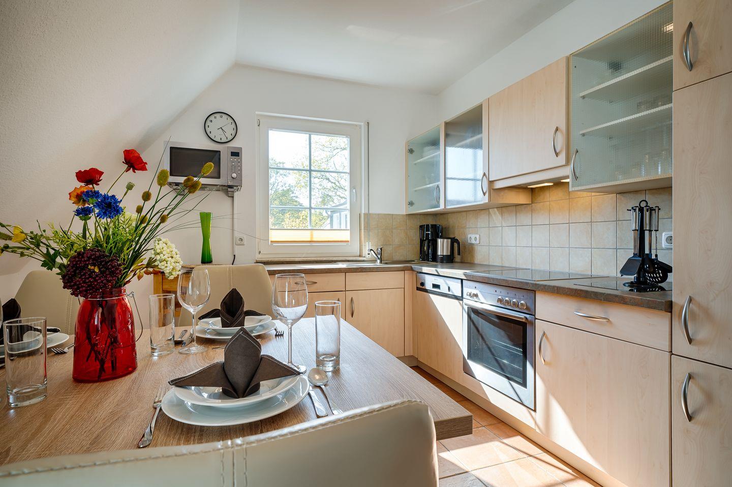 Wohnraum mit Ledergarnitur, offene Einbauküche und Esstisch für 4 Personen
