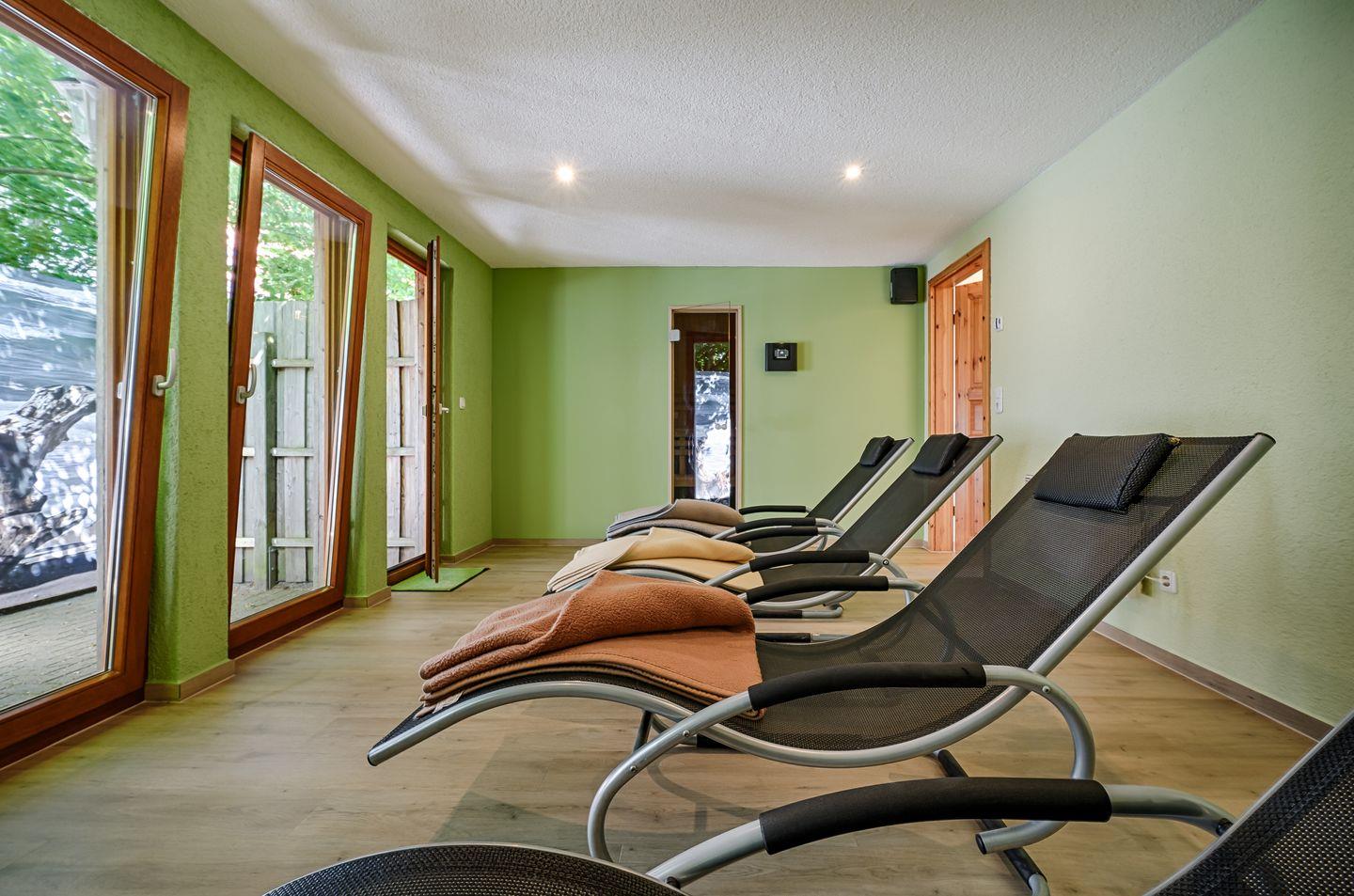separates Saunahaus mit Bio-Sauna, Ruheraum, Dusche und WC