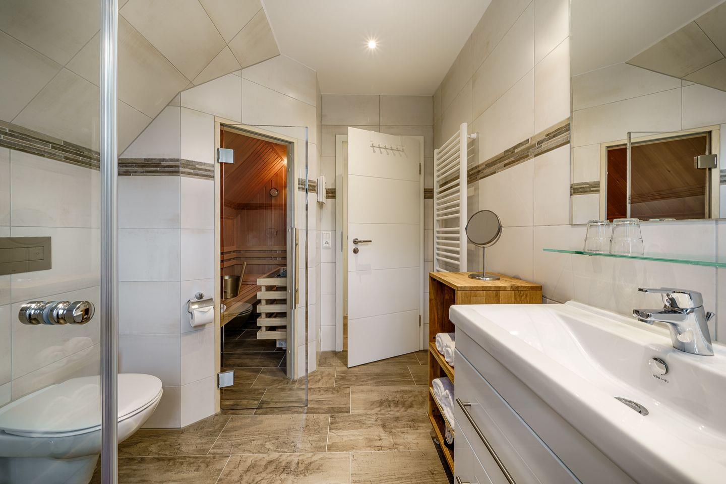 Tageslichtbad mit ebenerdiger Dusche, anliegender Sauna