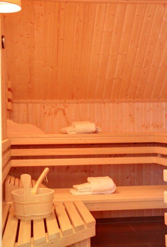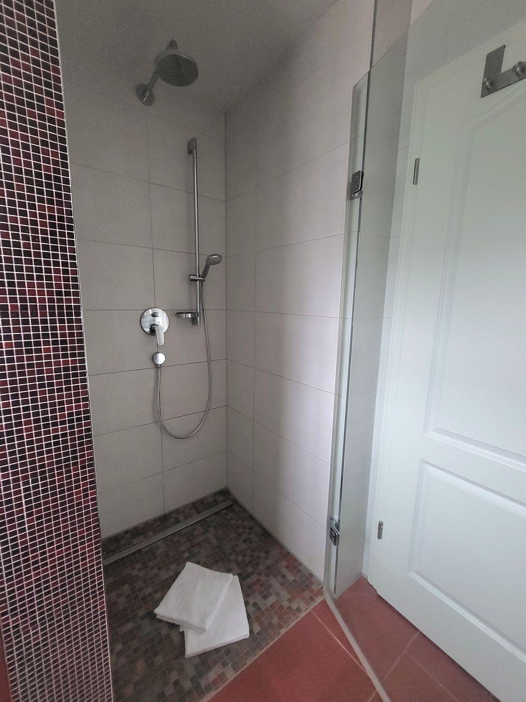 Bad mit ebenerdiger Dusche, anliegende Sauna